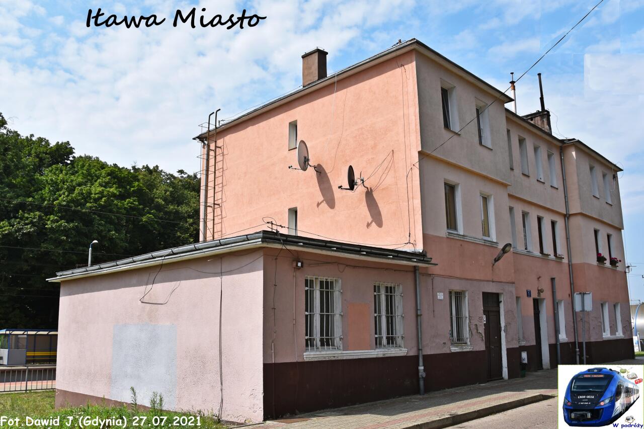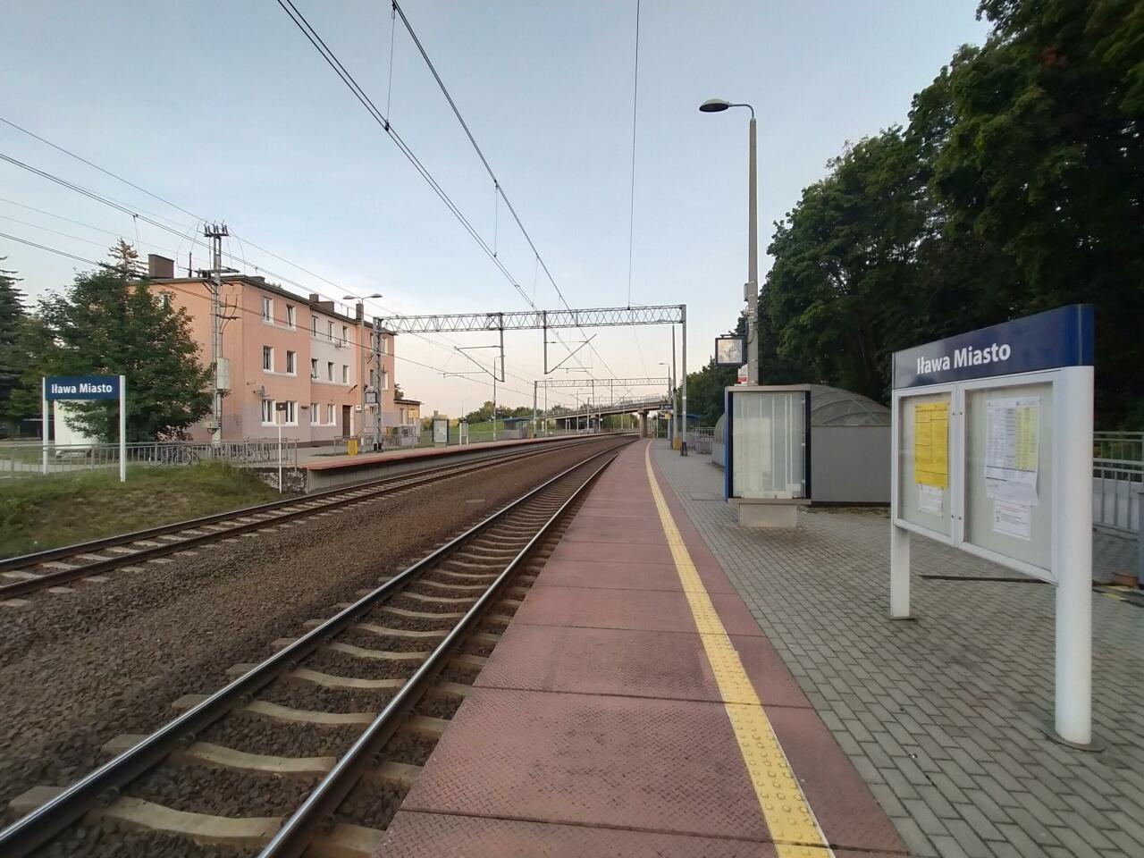 Budynek dworca PKP Iława Miasto. Po prawej peron, a w oddali wiadukt w ciągu ulicy Biskupskiej. Widok w kierunku Iławy Głównej, Działdowa i Warszawy.