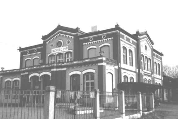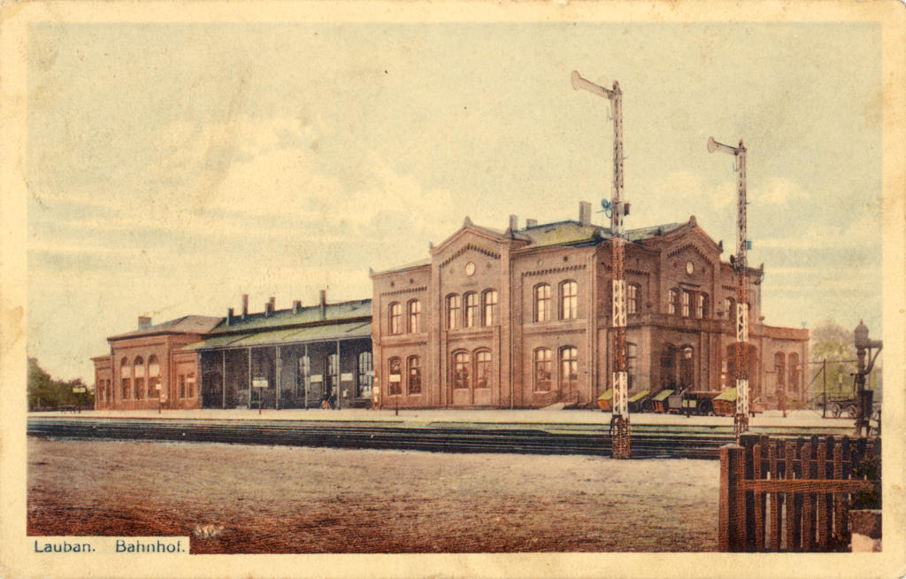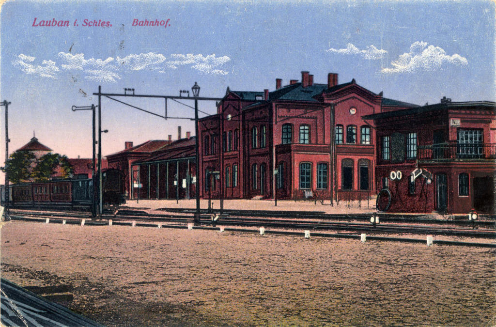 Budynek dworca widziany od strony ul. Dworcowej. Z lewej strony zachodnie perony dla pociągów w kierunku Węglińca, z prawej strony wschodnie perony obsługujące ruch do Mikułowej/Zgorzelca. Widok w kierunku południowym (Gryfów Śląski i Leśna). Ze zbiorów Adama Pacześniaka.