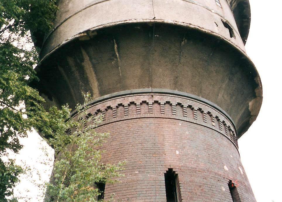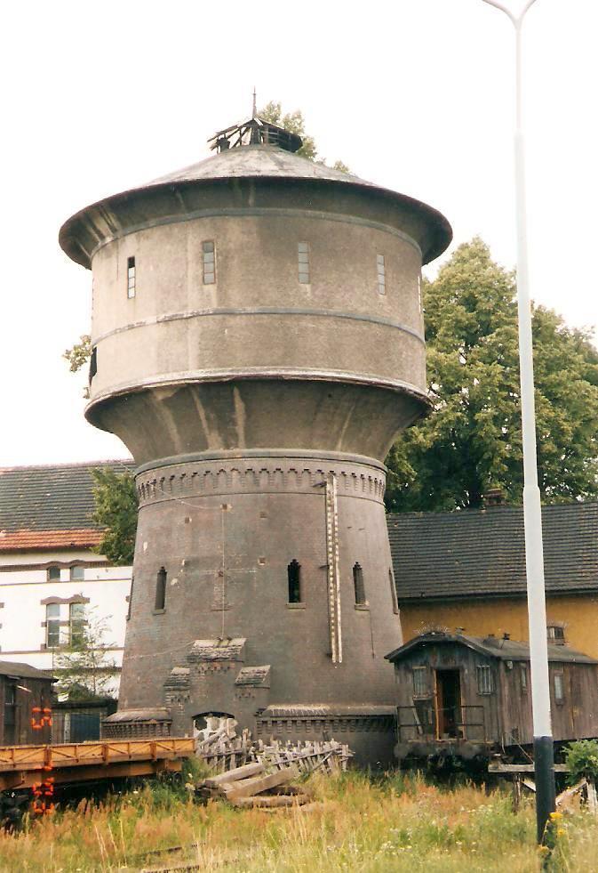 Lubań Śląski. Kolejowa wieża wodna, stojąca pomiędzy zgorzelecką (z lewej) i lubańską (z prawej) grupą torów w lipcu 2003 r. Widok od strony lokomotywowni w kierunku północnym (perony, dworzec).