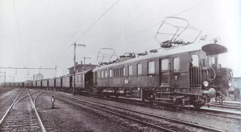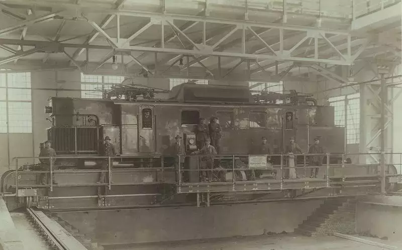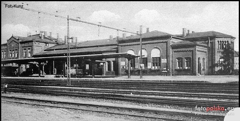 Wieża ciśnień i pruska lokomotywa elektryczna serii EG 538 - EG 549. Widok od strony peronów 1 i 2 w kierunku północno-wschodnim. W lewo budynek dworca.