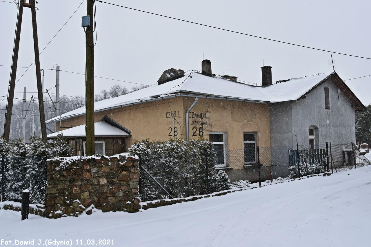 Budynek Dworcowy stacji Czarlin, na którym widać jeszcze kawałek napisu informującym o nazwie stacji.
