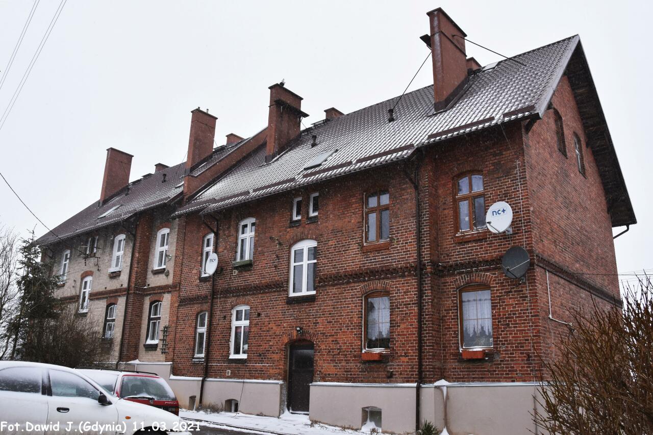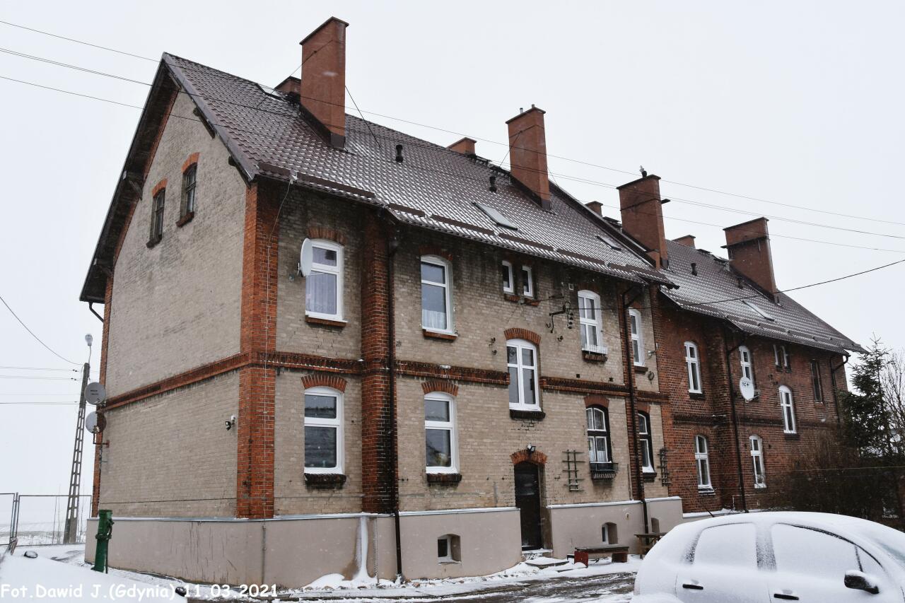 Kolejowe budynki mieszkalne, przyległe (ul. Dworcowa 25B i 25A). Obiekty widoczne od strony przeciwnej niż od strony torów. W lewo Tczew, w prawo Smętowo/Laskowice Pomorskie.