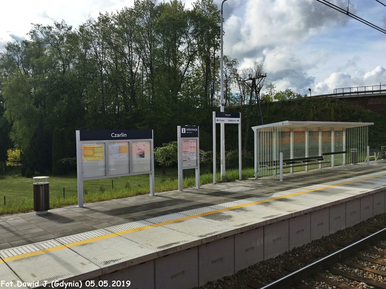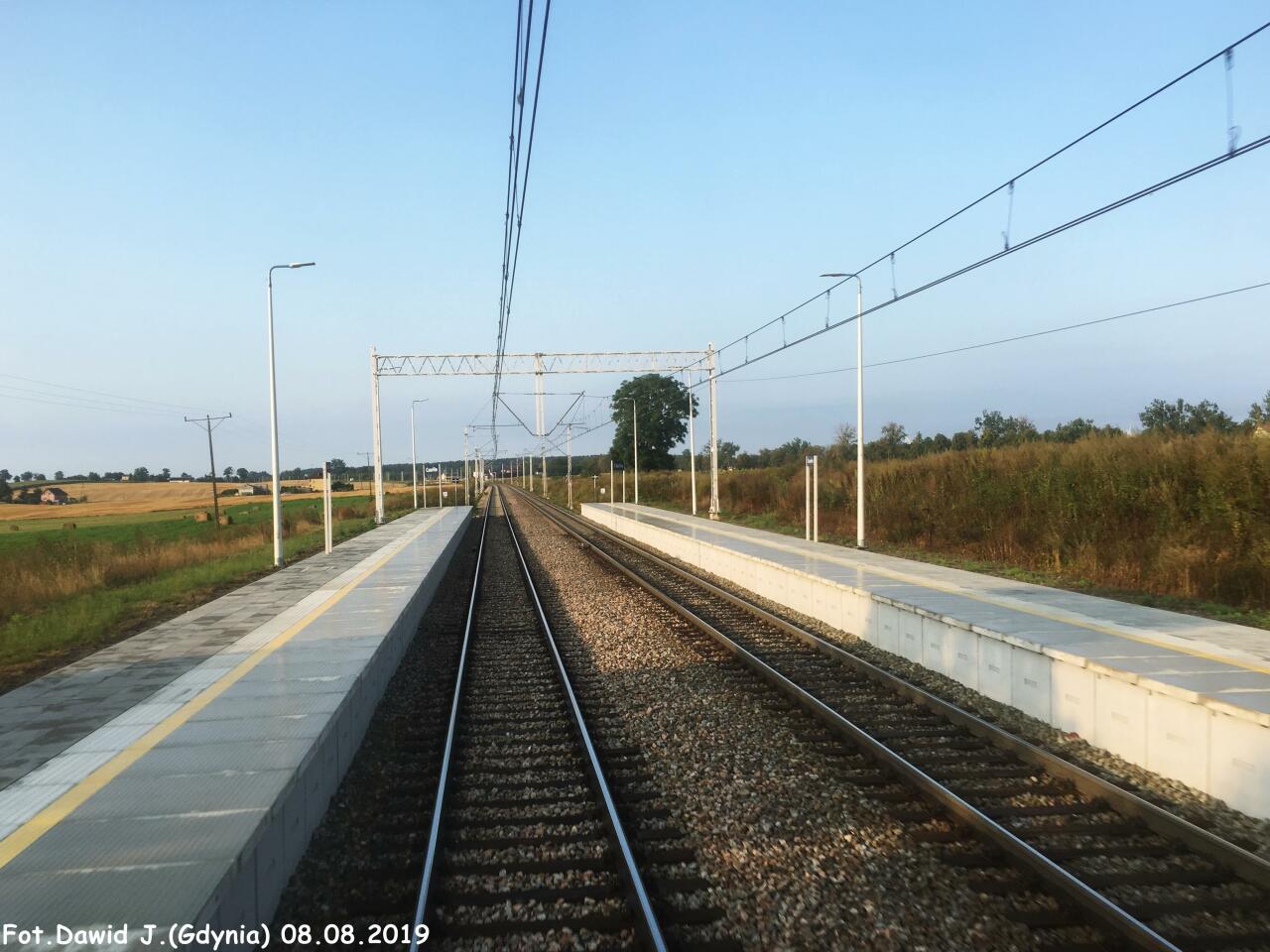 Widok na peron 1 na którym znajdują się: śmietnik, tablica informacyjna z nazwą przystanku osobowego, tablica informacyjna, tablica z kierunkami i wiata dla podróżnych. W lewo Tczew, w prawo Smętowo/Laskowice Pomorskie.
