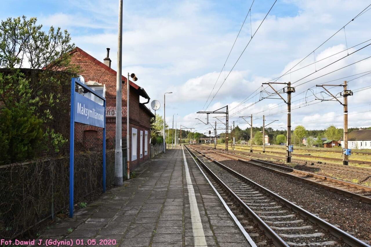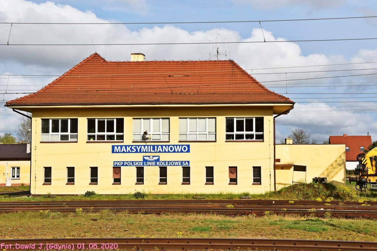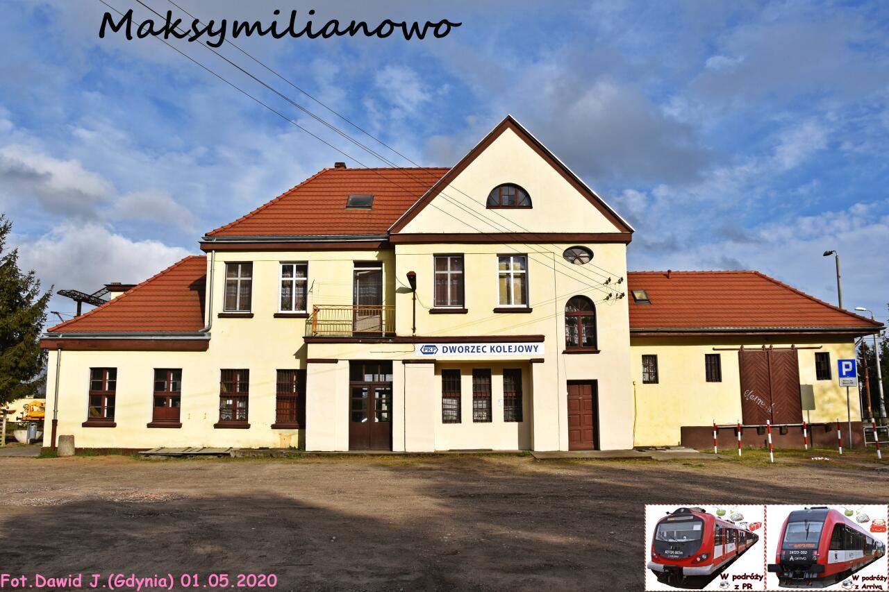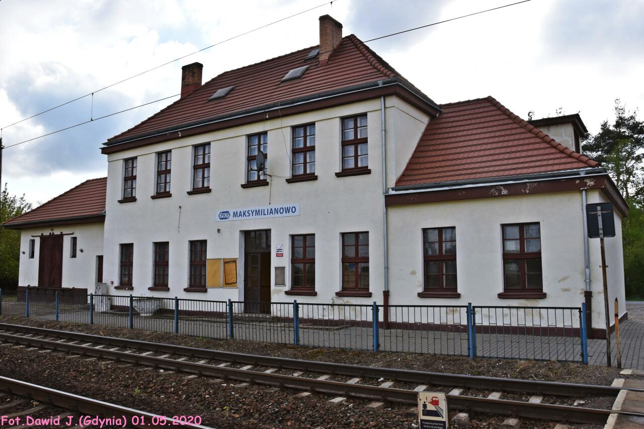Schemat części stacji Maksymilianowo. Stan na dzień 1 stycznia 1931r. Warto zwrócić uwagę na zaznaczoną linią wąskotorową z wyjazdem w kierunku Smukały. Do dzisiaj (05 listopada 2021) da się przejechać bezpiecznie samochodem osobowym starotorzem kolei wąskotorowej od Maksymilianowa do samej Smukały. Lasem jedzie się po wysokim dawnym nasypie. Źródło - Archiwum Państwowe w Gdańsku.