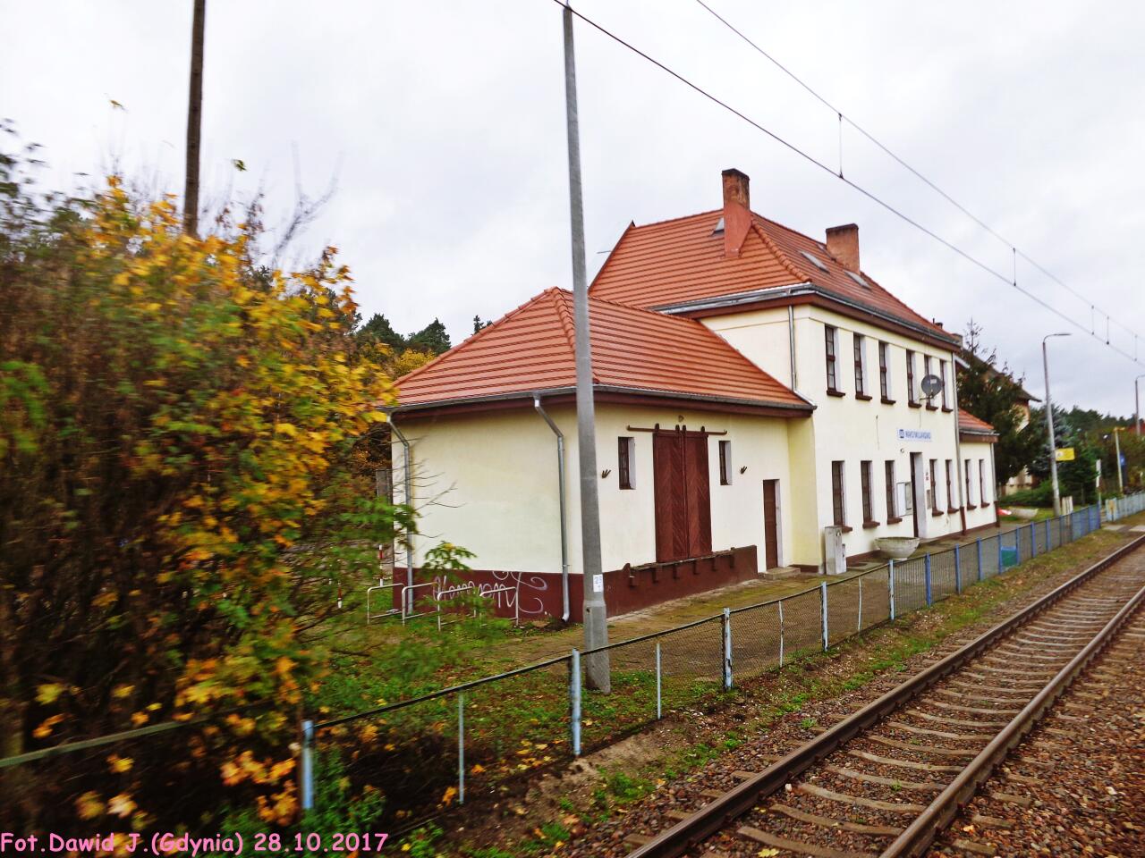 Widok z peronu 1 w kierunku Laskowic Pomorskich i Wierzchucina/Gdyni Głównej. Tablica z nazwą stacji. Kolejowy budynek mieszkalny (ul. Dworcowa 5) znajduje się po lewej stronie.