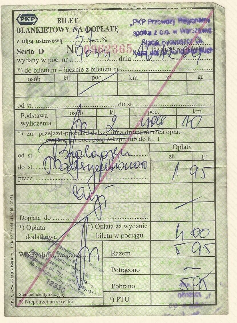 Bilet na przejazd z Bydgoszczy Głównej do Maksymilianowa wydany w pociągu.
