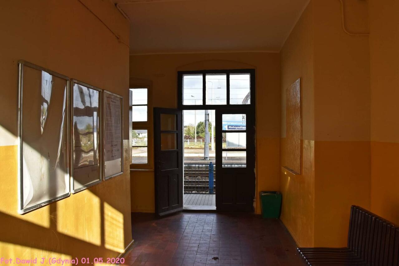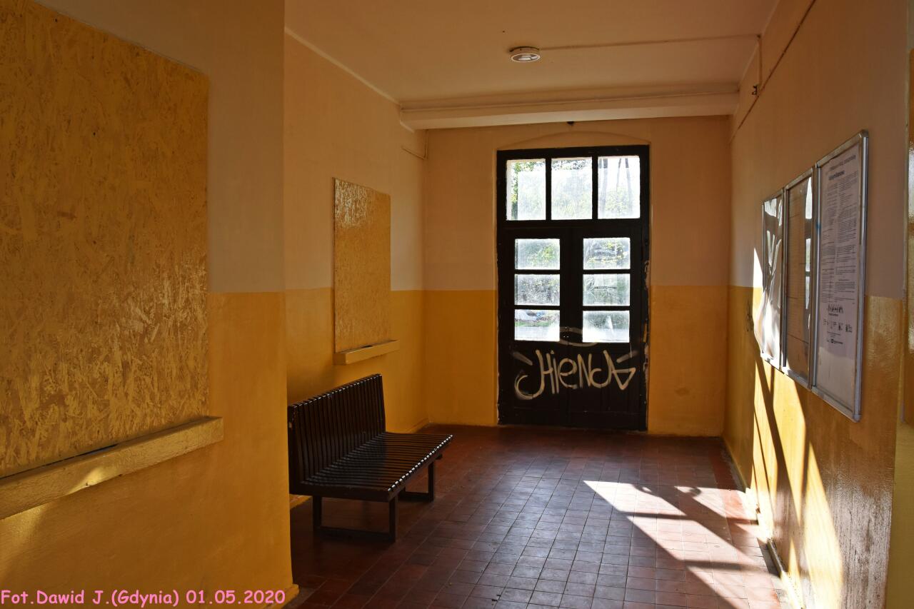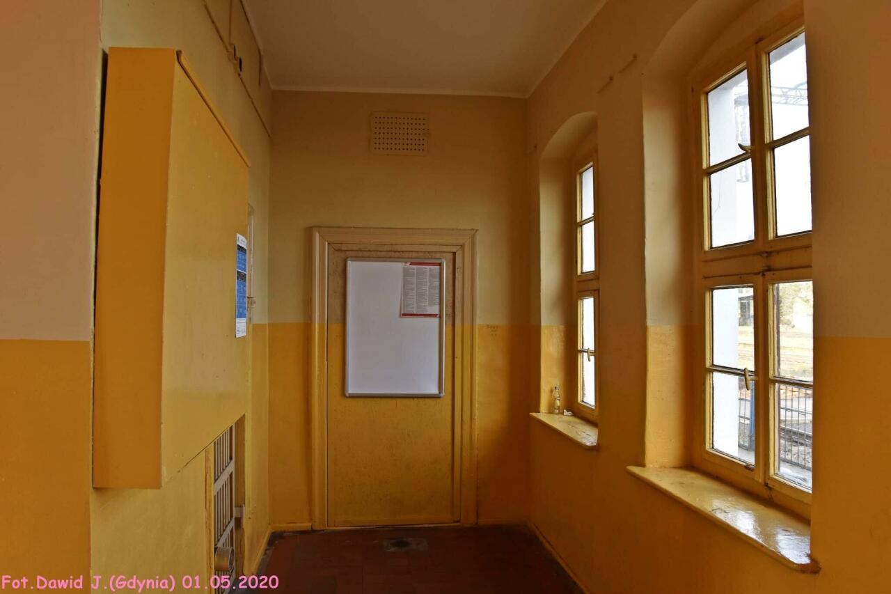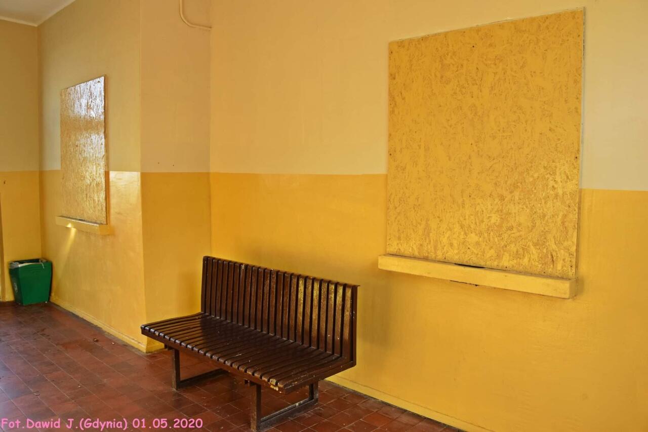 Wnętrze budynku dworcowego. Poczekalnia dla podróżnych. 2 nieczynne okienka kas biletowych.