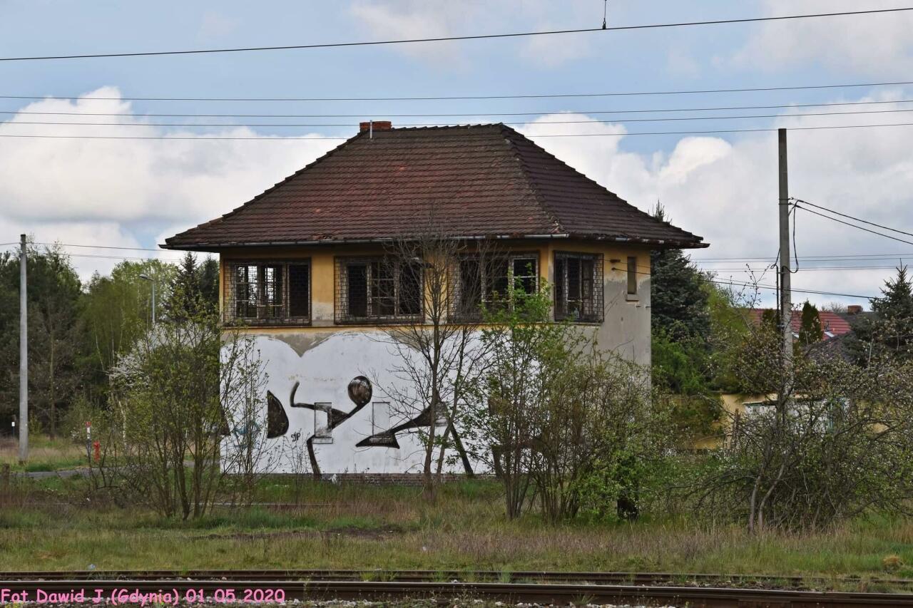 Budynek dawnej nastawni widoczny od strony torów. W lewo Laskowice Pomorskie i Wierzchucin/Gdynia Główna, w prawo Bydgoszcz Główna.