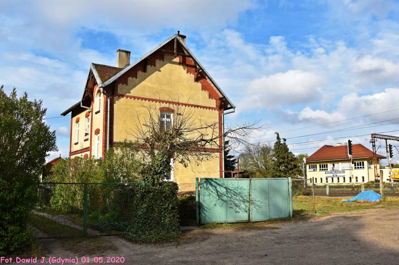 Kolejowy budynek mieszkalny (ul. Dworcowa 7) widoczny od strony torów. W lewo Bydgoszcz Główna, w prawo Laskowice Pomorskie i Wierzchucin/Gdynia Główna.