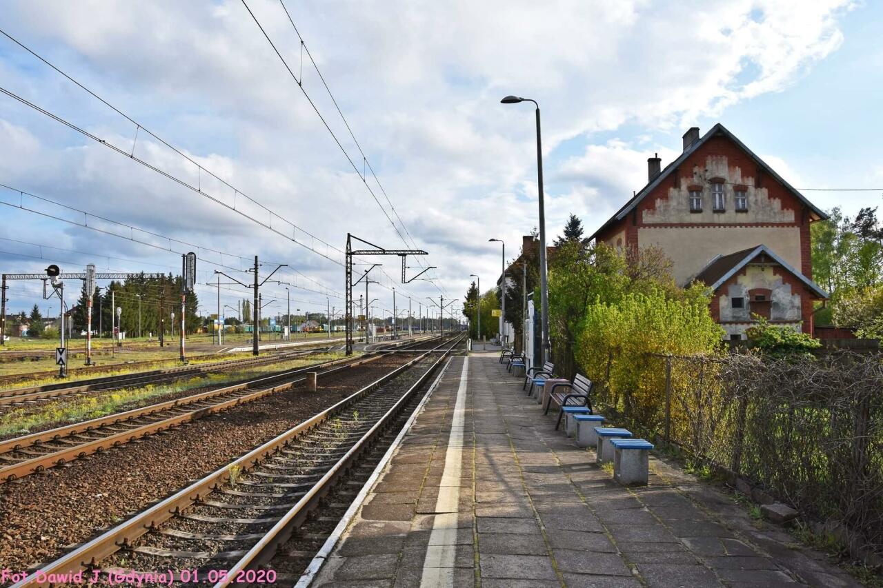Widok z peronu 1 w kierunku Bydgoszczy Głównej. Kolejowy budynek mieszkalny (ul. Dworcowa 11) znajduje się po prawej stronie.