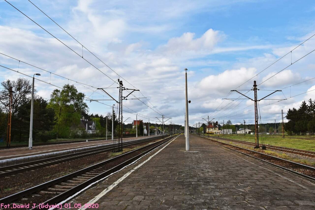 Widok na peron 1 oraz w kierunku Laskowic Pomorskich i Wierzchucina/Gdyni Głównej. Kolejowe budynki mieszkalne (ul. Dworcowa 11, 9, 7 i 5) znajdują się po lewej stronie.