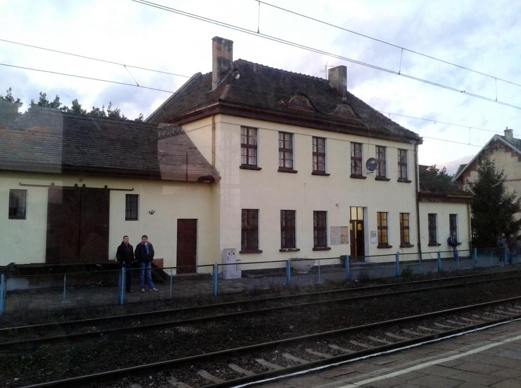 Budynek stacji widziany z okna pociągu osobowego do Gdyni Głównej.