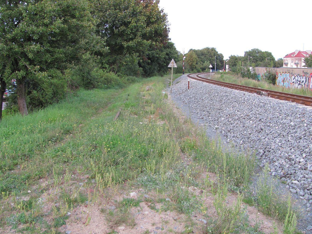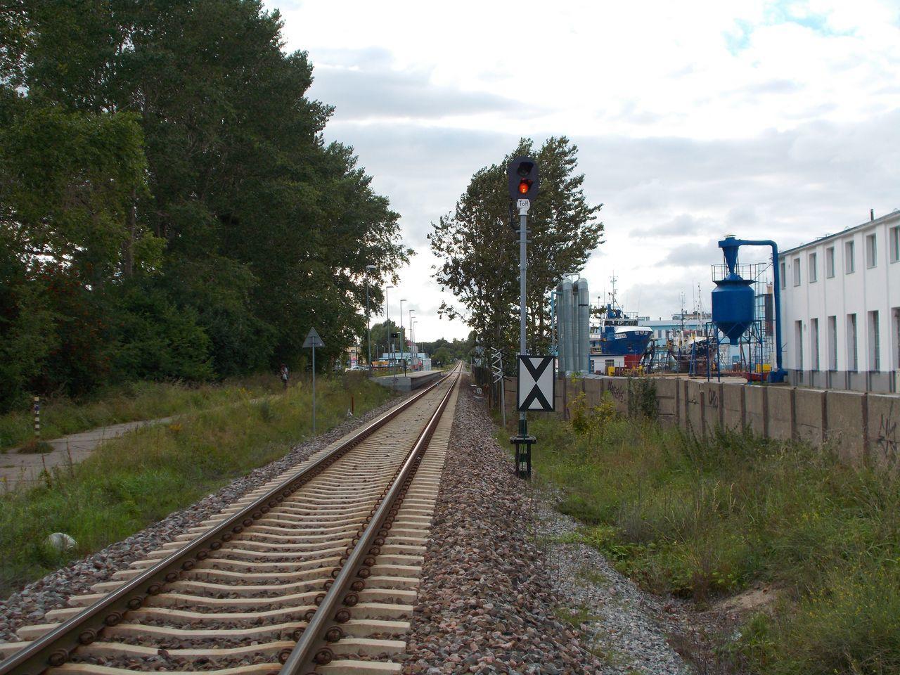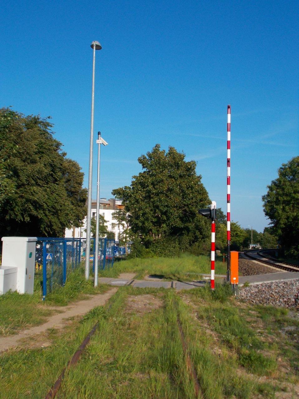 Widok na pozostałość torów bocznicy prowadzącej do Rybackiej Stoczni Remontowej. Na prawo zmodernizowana linia Reda - Hel (widok w kierunku Helu).