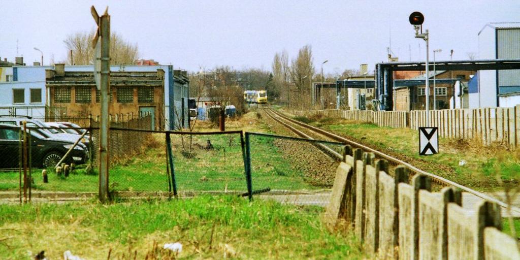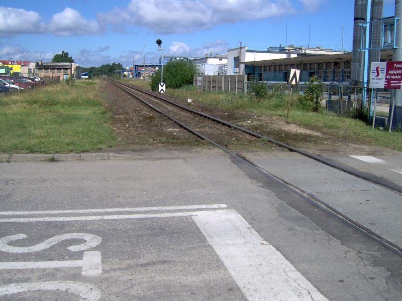 Widok z ul. Portowej na częściowo zachowane tory bocznicy do Rybackiej Stoczni Remontowej. Na prawo linia Reda - Hel (widok w kierunku Helu).