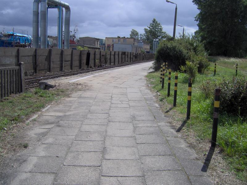 Zachowany fragment torów pomiędzy ul. Kolejową a stykiem ulic Towarowej i Rybackiej. Po prawej zabezpieczone rogatkami przejście dla pieszych na linii Reda-Hel (widok w kierunku Helu).