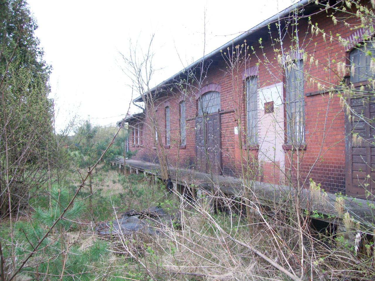 Magazyn towarowy z rampą boczną i resztki toru doń prowadzącego.