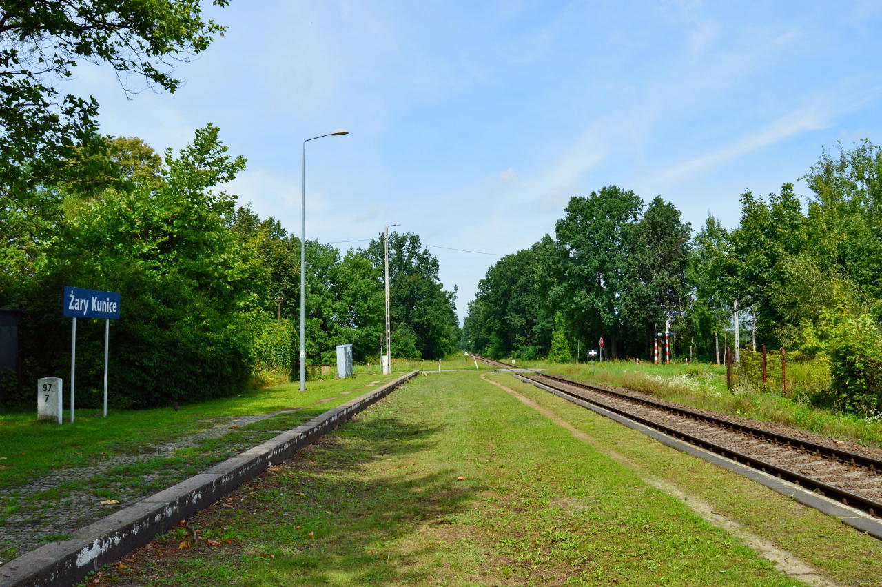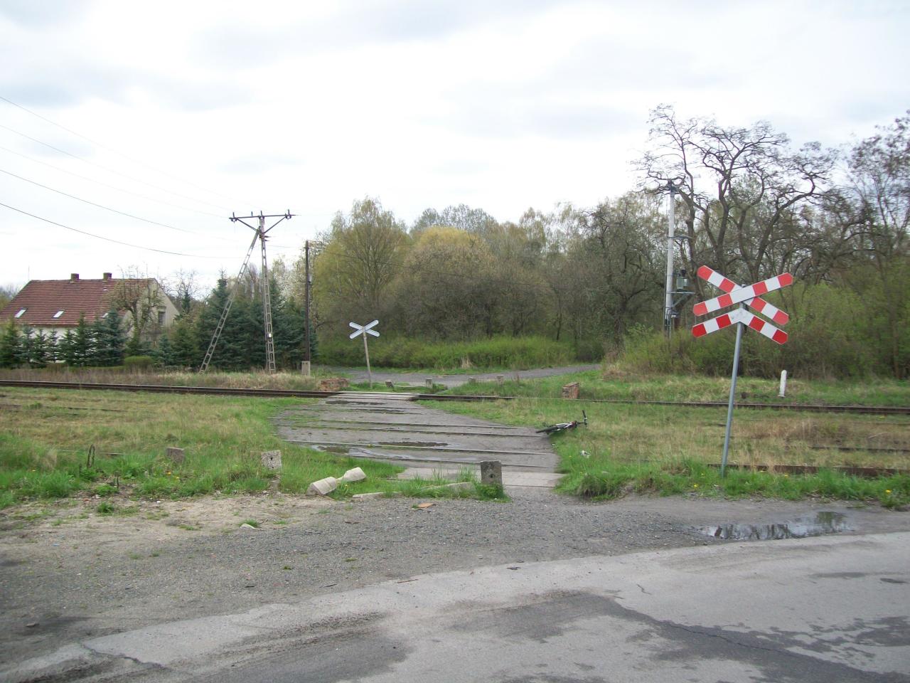 Przejście przez tory w południowej części dawnej stacji przy ul. Powstańców Wielkopolskich. Zwraca uwagę niekonsekwencja w oznakowaniu - z tej strony jest to przejazd wielotorowy, z drugiej strony jest to przejazd jednotorowy. W lewo przystanek Kunice, w prawo Jankowa Żagańska.