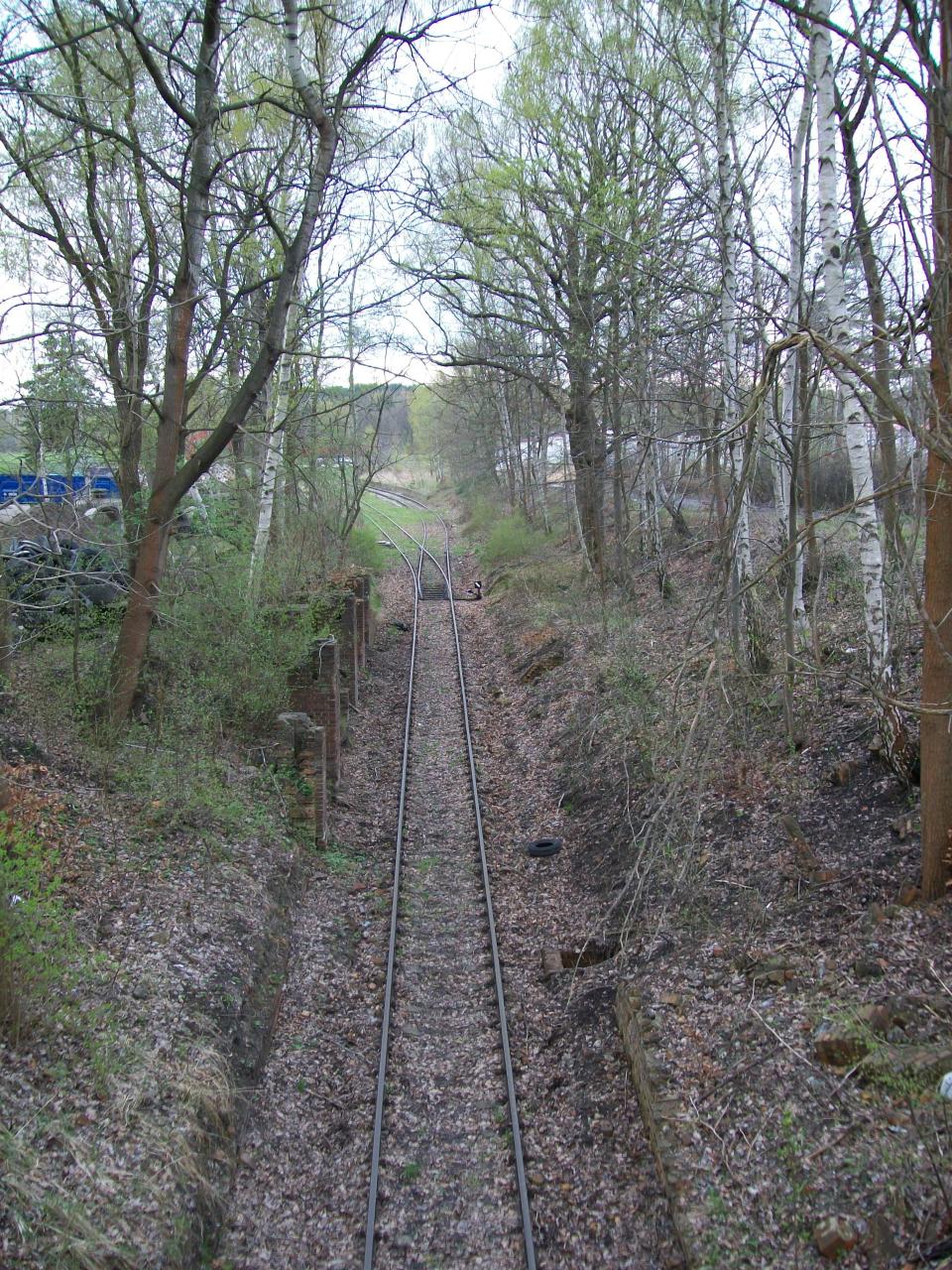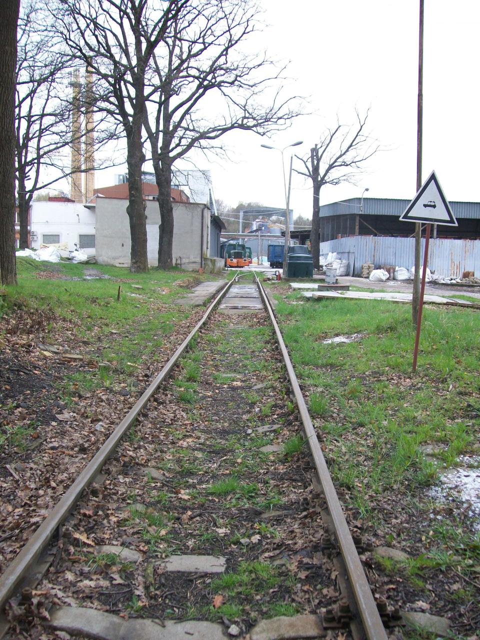 Bocznica do huty szkła Vitrosilicon - widok w kierunku dawnej stacji Kunice z wiaduktu drogowego w ciągu ul. Westerplatte. Z lewej strony pozostałości po rampie ładunkowej.