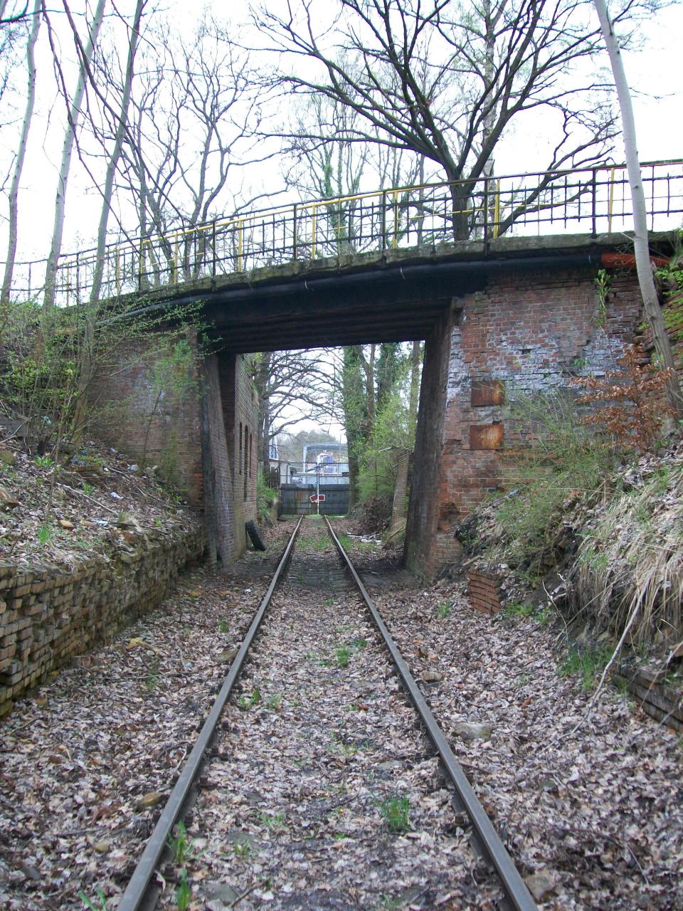 Wiadukt nad bocznicą do huty szkła Vitrosilicon, obecnie jest w tak złym stanie, że tylko piesi i rowerzyści mogą się po nim przemieszczać. W tle brama kolejowa na teren zakładu.
