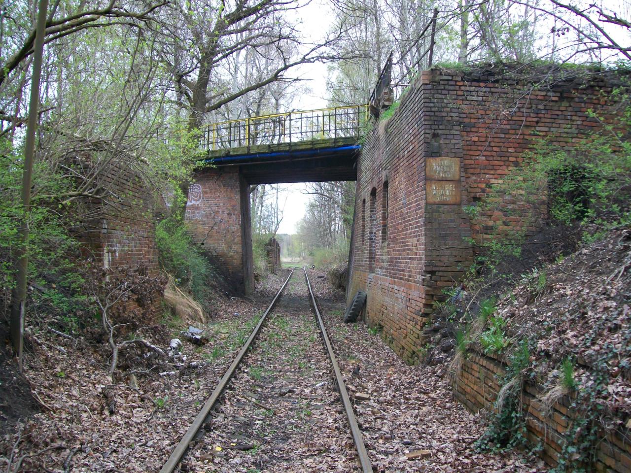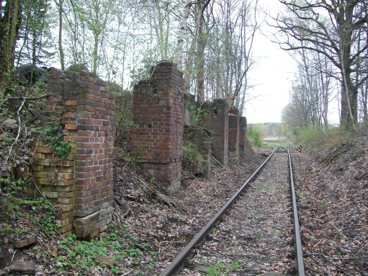 Wiadukt nad bocznicą do huty szkła Vitrosilicon, obecnie jest w tak złym stanie, że tylko piesi i rowerzyści mogą się po nim przemieszczać. Z prawej strony pozostałości po jakimś bunkrze. Widok w kierunku dawnej stacji Kunice.