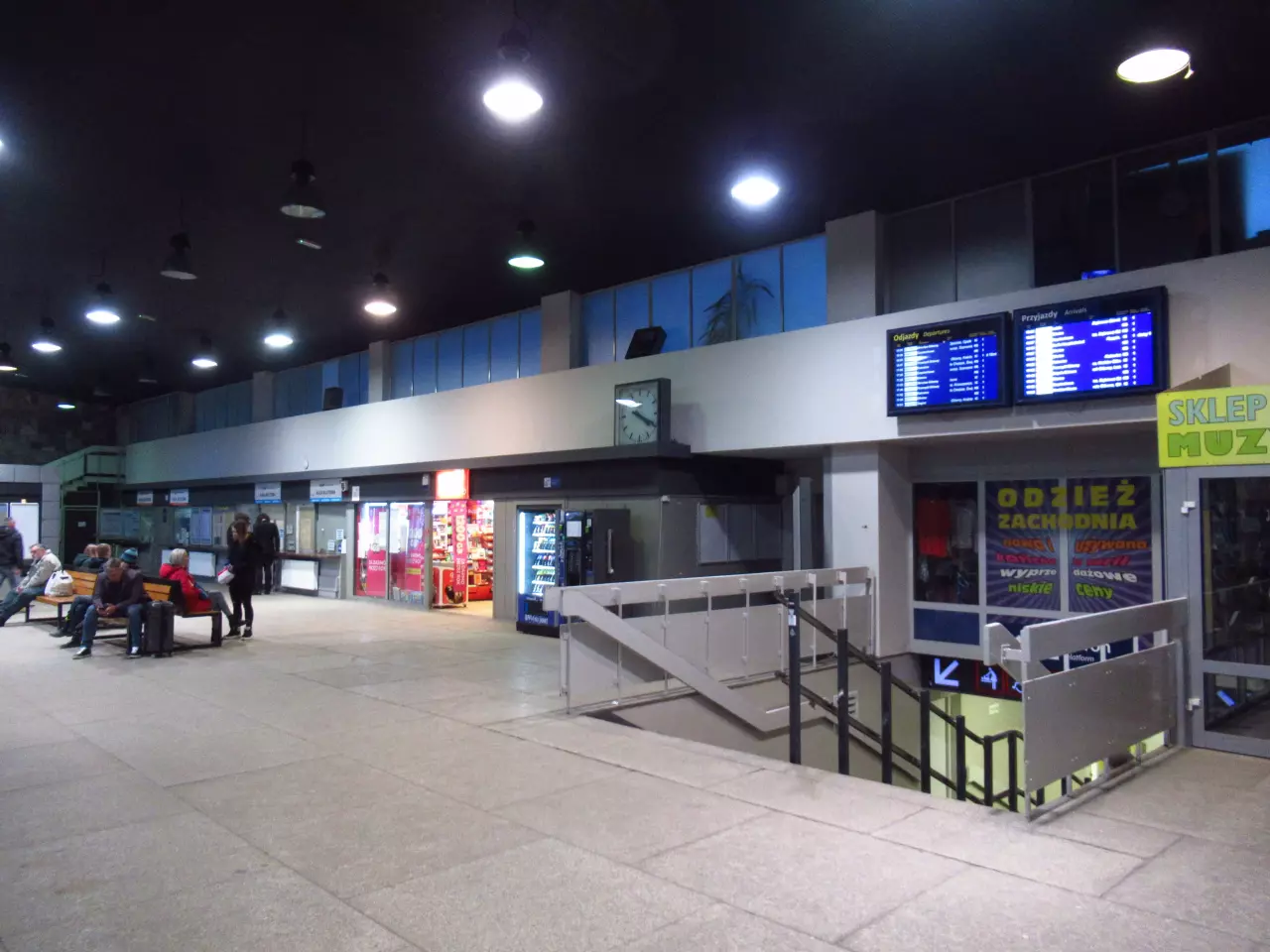 To nie jest prawda. W latach osiemdziesiątych dwudziestego wieku takie urządzenia zostały tam absolutnie na pewno zainstalowane. Zupełnie nietypowe, jak na warunki PRLu, bo nie czeskie Pragotrony, ale wyświetlacze składające się z małych żarówek. Nad każdym z dwóch torów wisiały dwie takie tablice, w przejściu podziemnym nigdy nie było żadnej, a w hali dworcowej wisiała duża tablica "zbiorcza", dokładnie nad schodami prowadzącymi do tunelu. Całość nie funkcjonowała długo: niczym nie zabezpieczone żarówki na peronach szybko się przepalały, nikt nie dbał o ich wymianę. Po najwyżej dwóch latach system wyłączono. Tablice wisiały jeszcze jakiś czas nad peronami, ale nie doczekały się naprawy więc w końcu i one zniknęły, a w ślad za nimi główna tablica w hali dworca. Wydaje mi się, że cała ta historia to pierwsza połowa lat osiemdziesiątych dwudziestego wieku, ale może ktoś pamięta to dokładniej. -