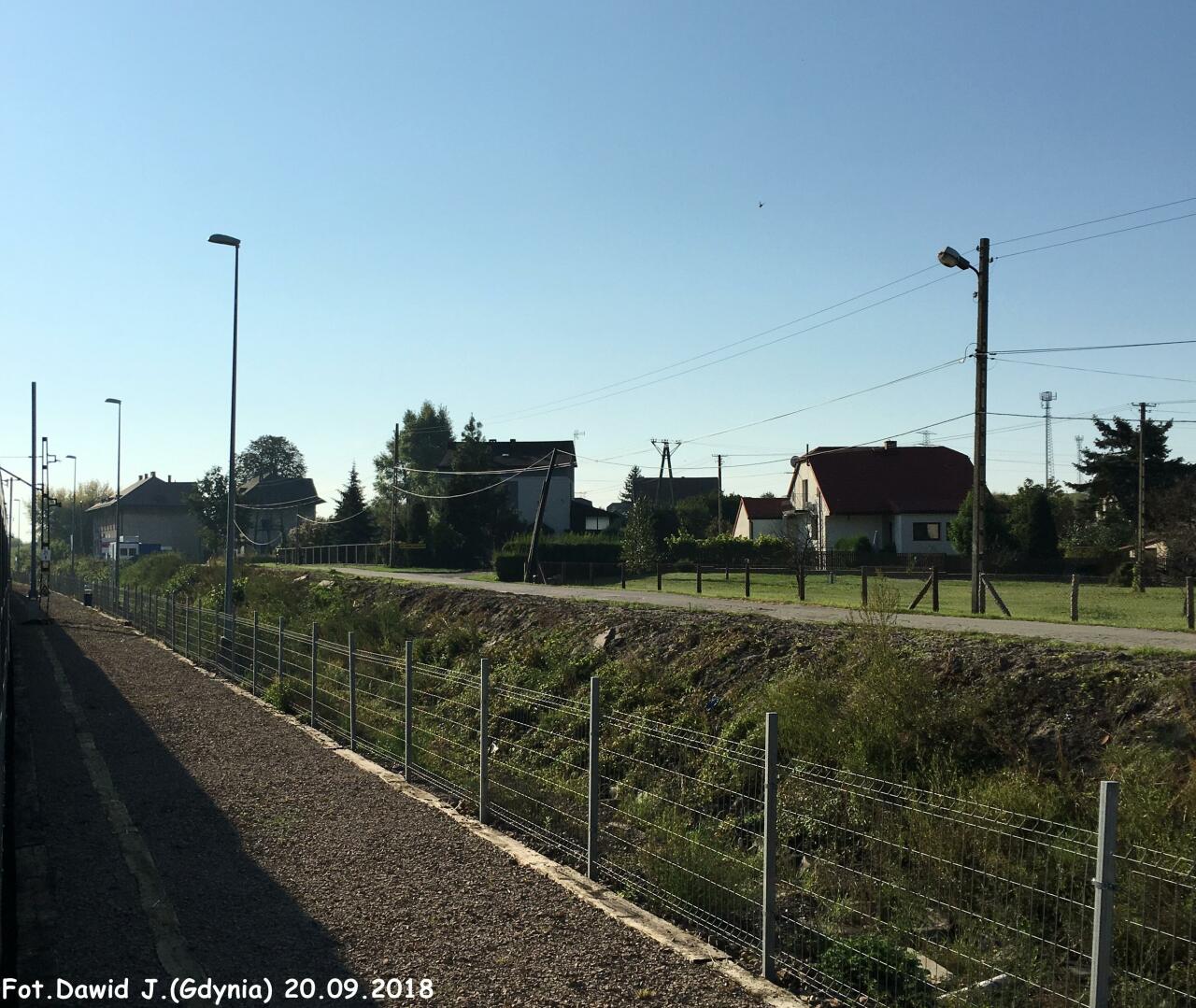Jeden z budynków kolejowych pogp Balin, droga do budynku dworca (widoczny po lewej stronie). Widok w stronę Trzebini.