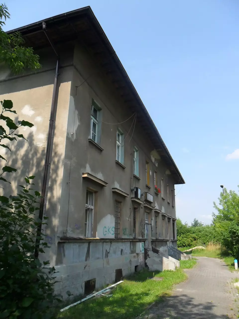 Kolejowy budynek mieszkalny widoczny od strony peronów; w prawo Jaworzno Szczakowa, w lewo Trzebinia/Kraków.