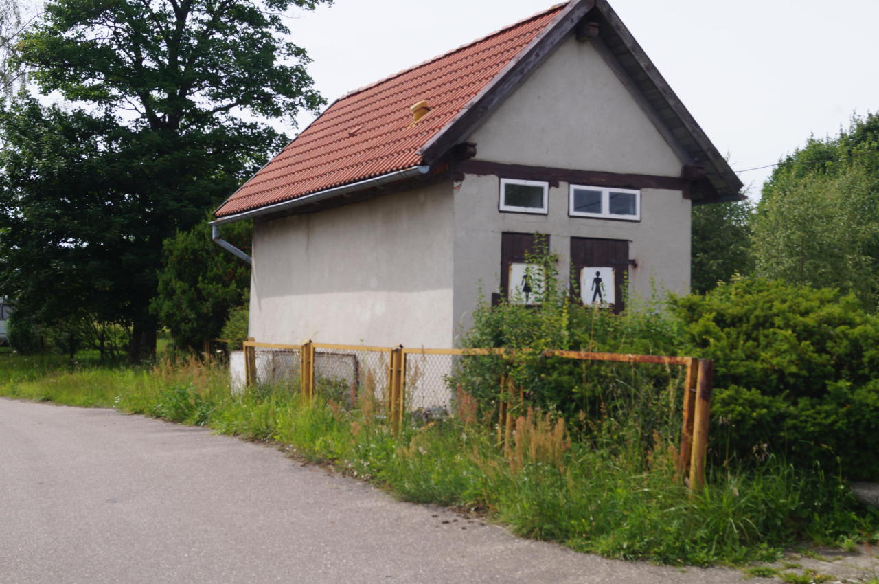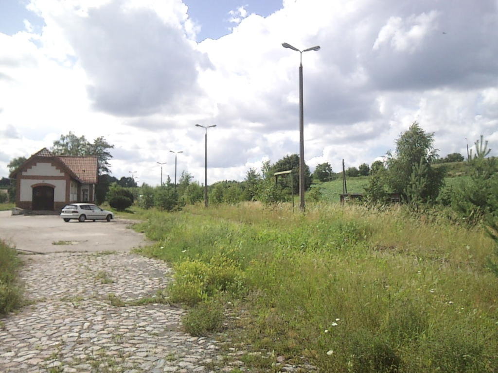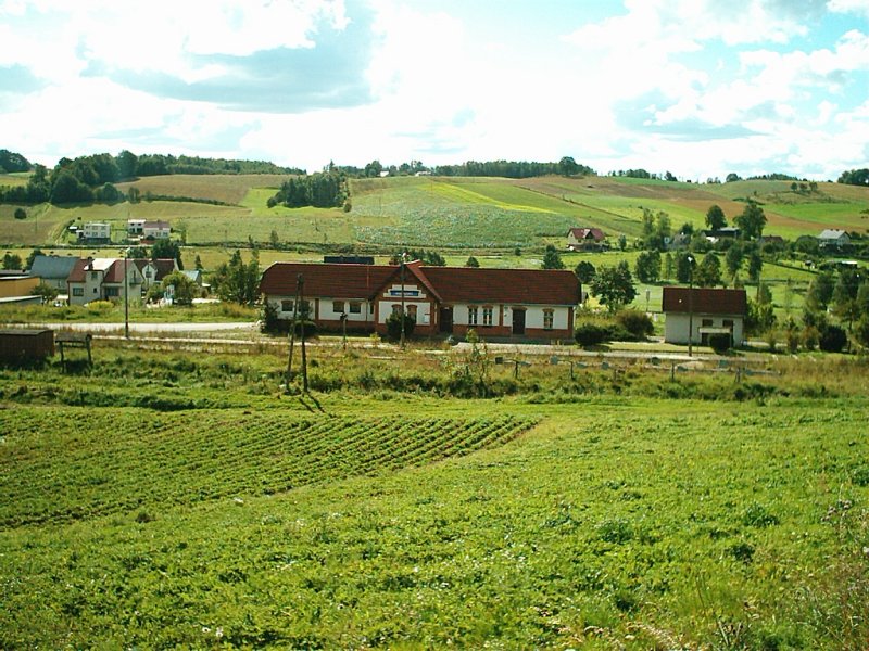 Widok dworca z szerszej perspektywy, od strony wjazdu z Kartuz. Dawna stacja nie wygląda najlepiej oprócz budynku dworca, który jest zamieszkany, a co ważniejsze, jest w dobrym stanie. Przynajmniej po elewacji tak można sądzić.