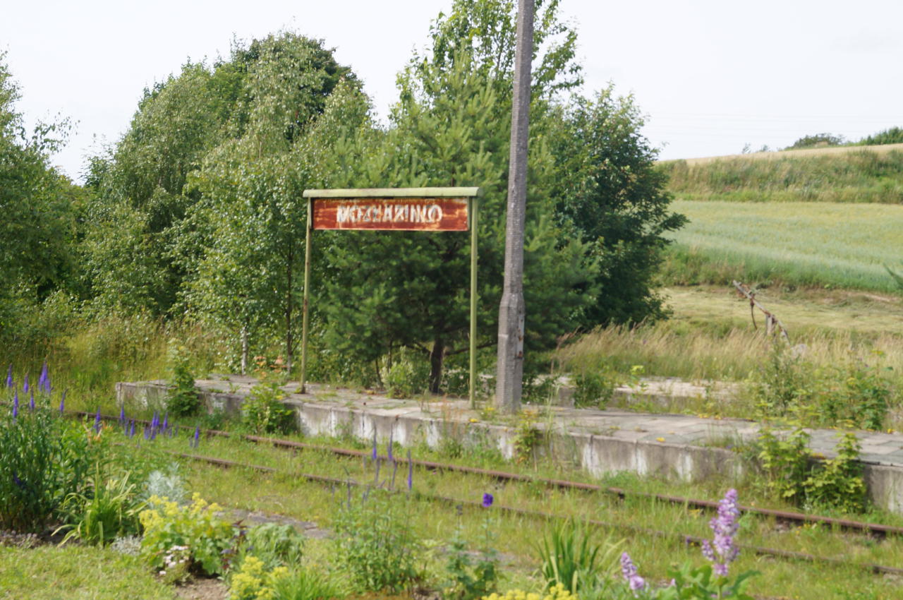 Miechucino. Wieża wodna stojąca na północny-zachód od dworca (za plecami). Na pierwszym planie fragment torowiska. W prawo Kartuzy, w lewo Lębork.