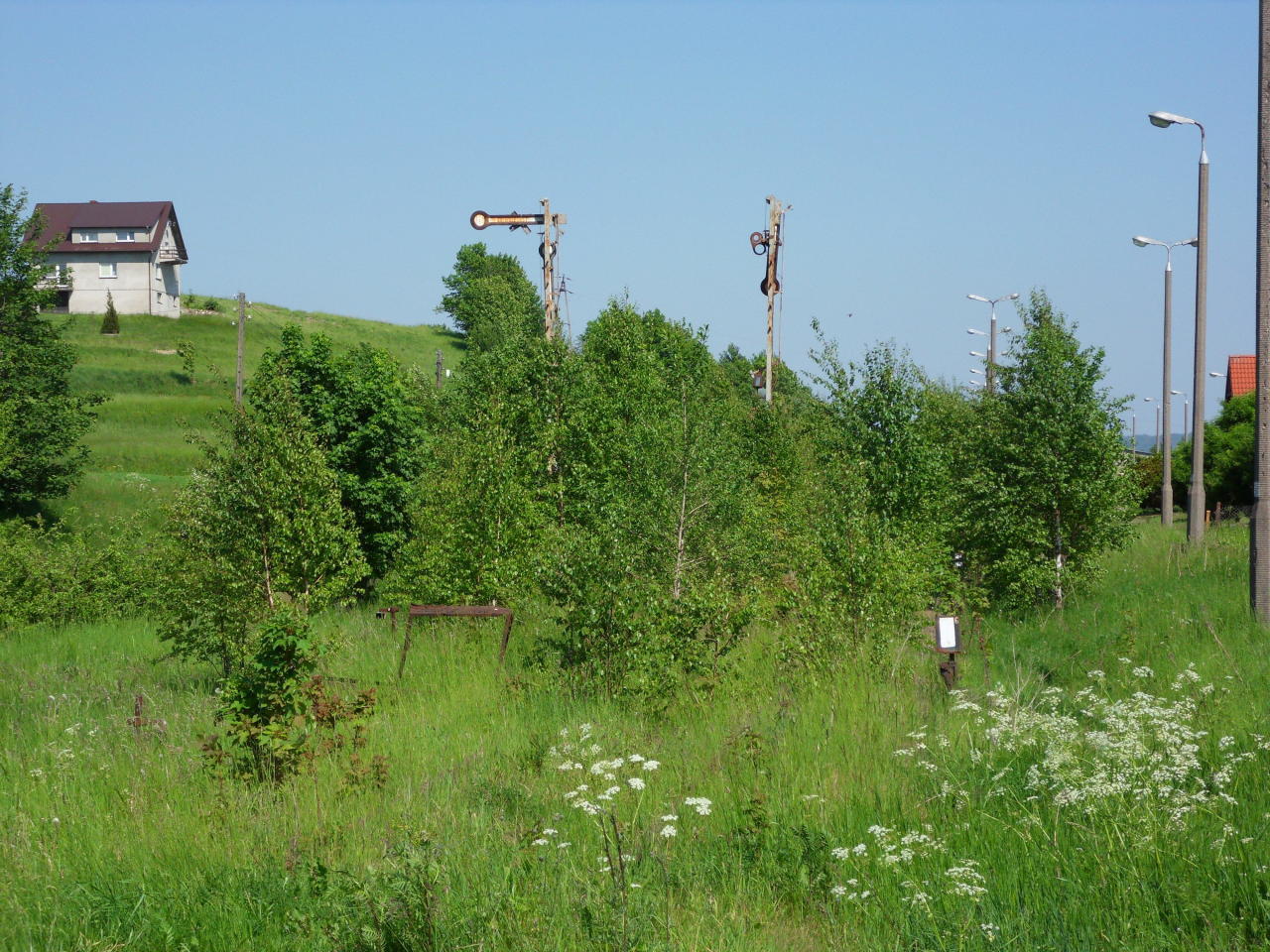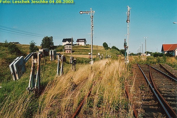 Wjazd na dawną stację od strony Lęborka; widoczne semafory wyjazdowe w tamtym kierunku.
