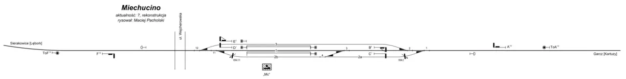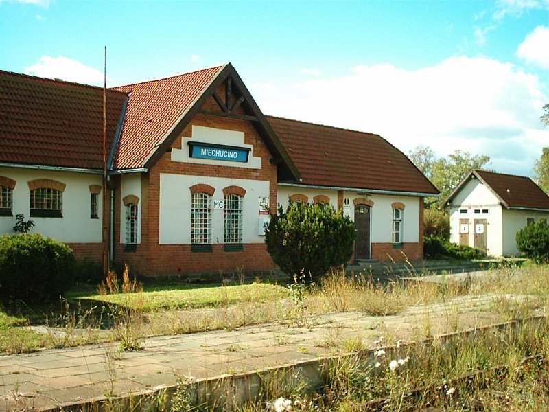Dworzec kolejowy w Miechucinie. W przybudówce do dworca, na parterze mieściła się nastawnia dysponująca. Widok od strony peronów: w lewo Kartuzy, w prawo Lębork.