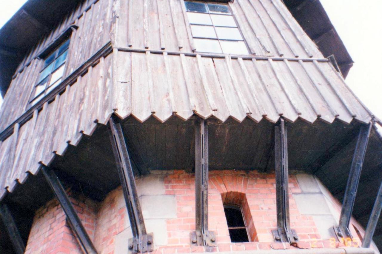Miechucino. Część zbiornikowa wieży wodnej ze wskaźnikiem poziomu wody w zbiorniku wieży.