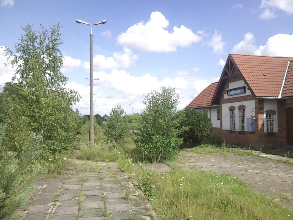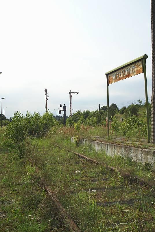 Miechucino. Perony i budynek dworca od strony wjazdu z Lęborka. W przybudówce do dworca, na parterze mieściła się nastawnia dysponująca. Niestety, spore drzewa już wyrosły na torowisku
