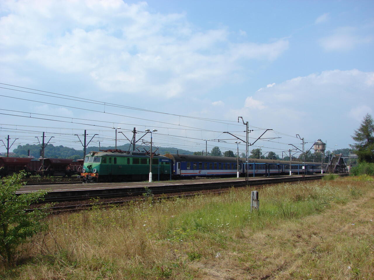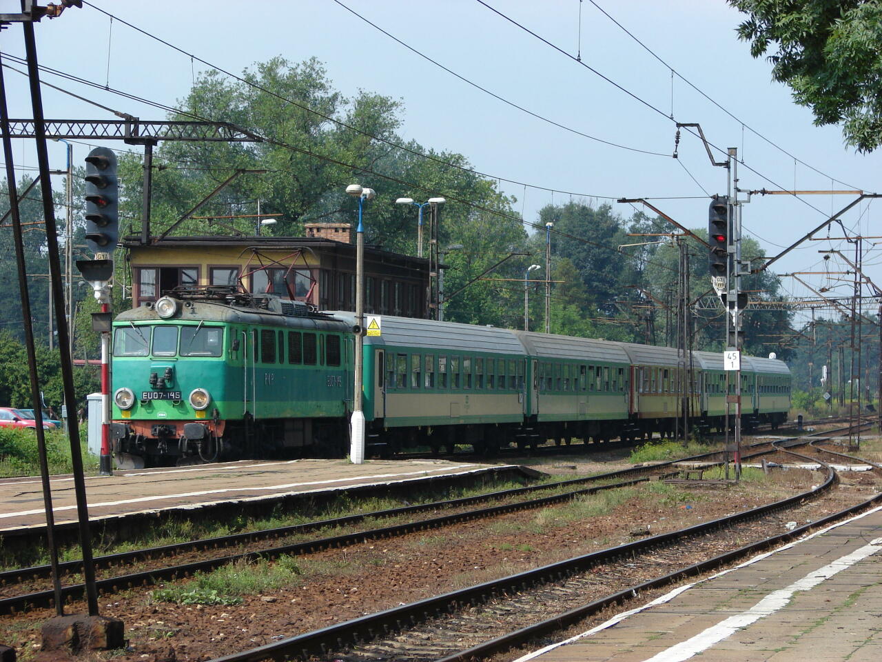 Pociąg pośpieszny z EU07-145 w kierunku Krakowa za nim fragment nastawni. Widok spod dworca.