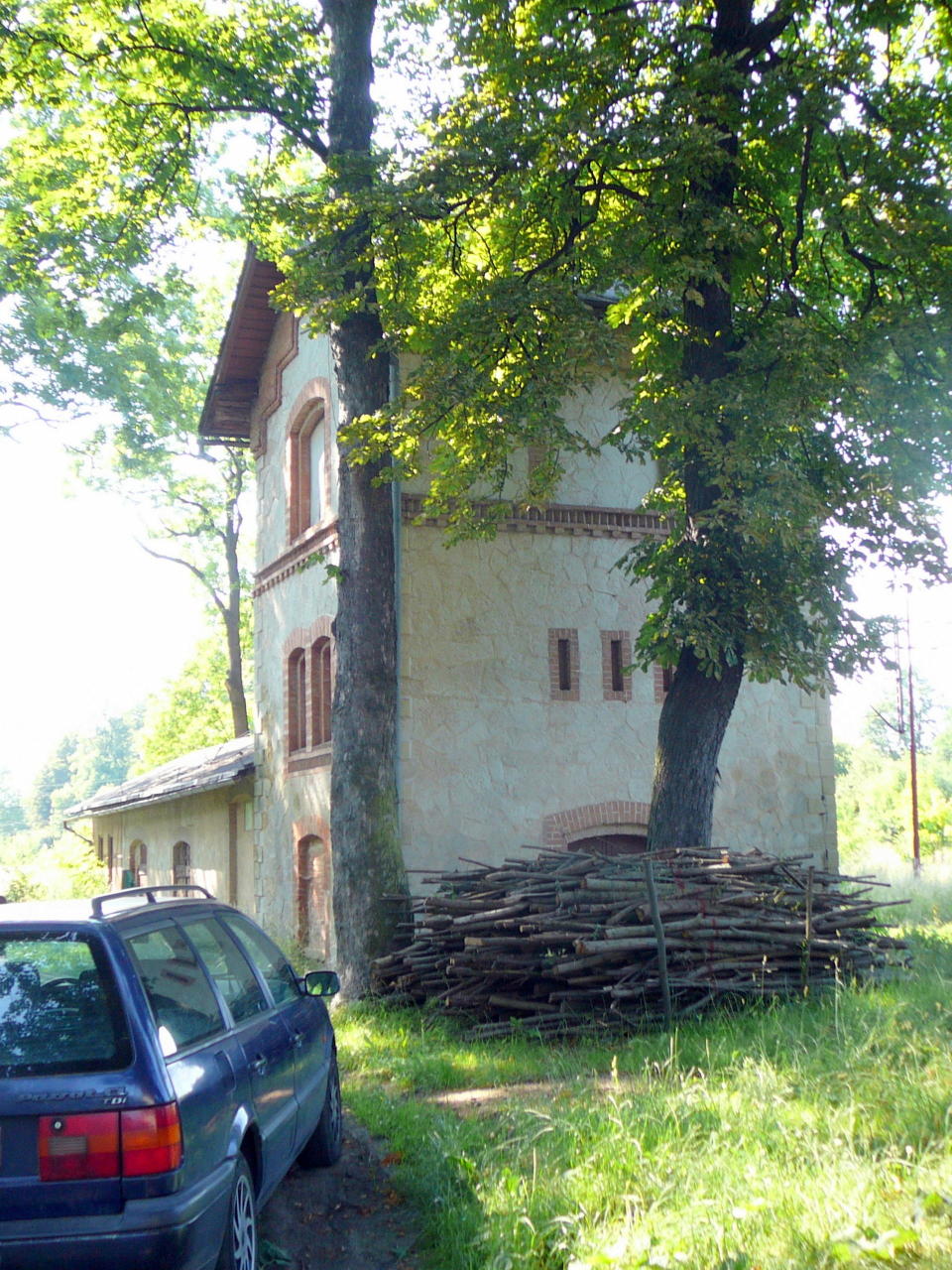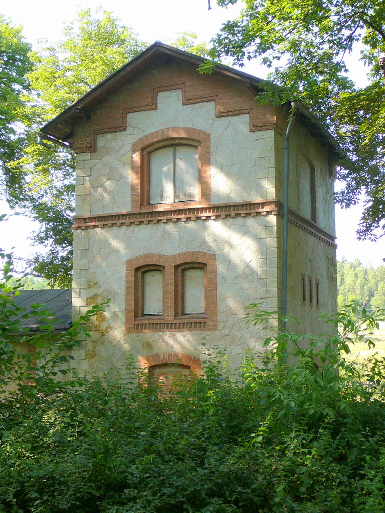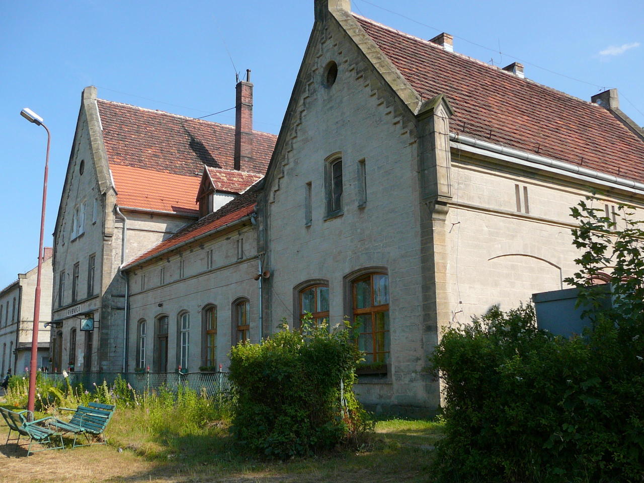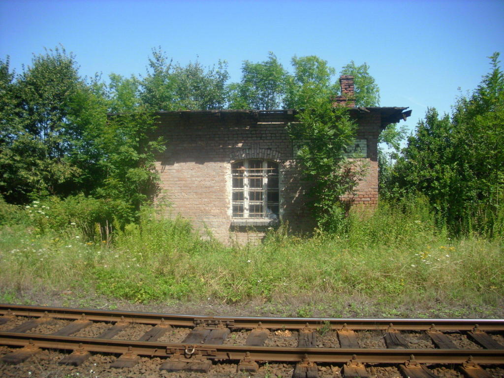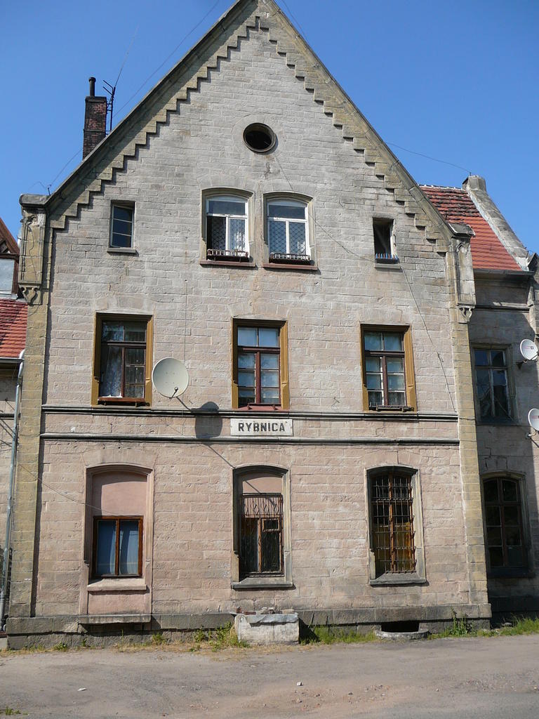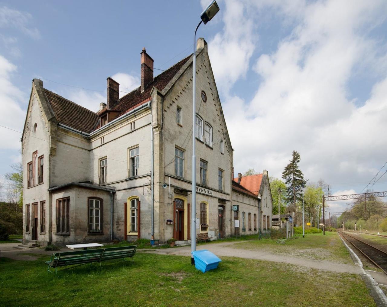 PKP Rybnica. Budynek dworcowy. Widok z pociągu relacji Jelenia Góra - Zielona Góra.