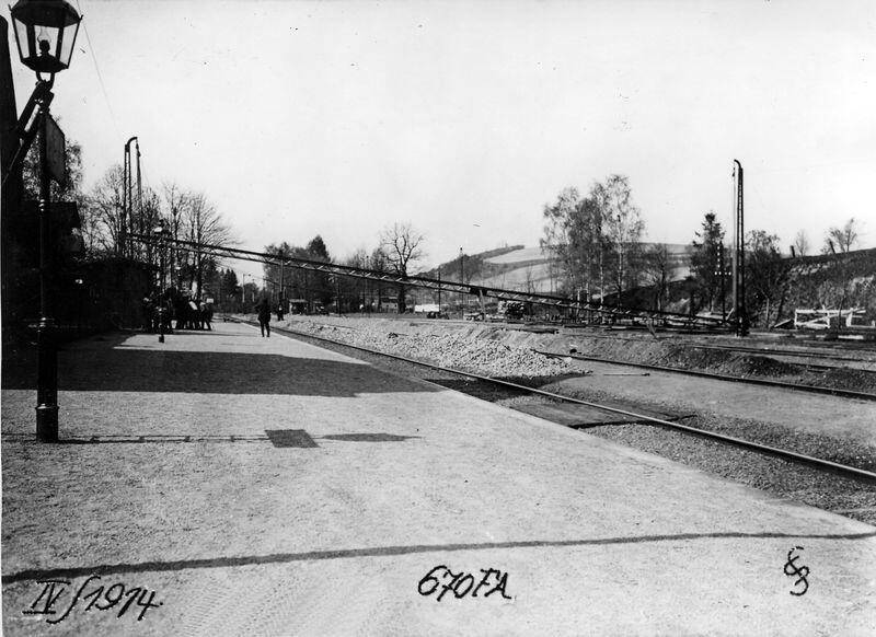 Montaż długiej na 31,5 m belki poprzecznej na stacji Reibnitz. Widok w kierunku Gryfowa Śląskiego. Ze strony http://www.zackenbahn.de/elektrifizierung.html (Siemens Corporate Archive).