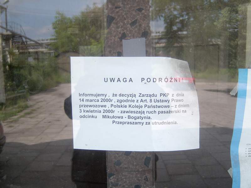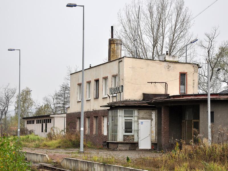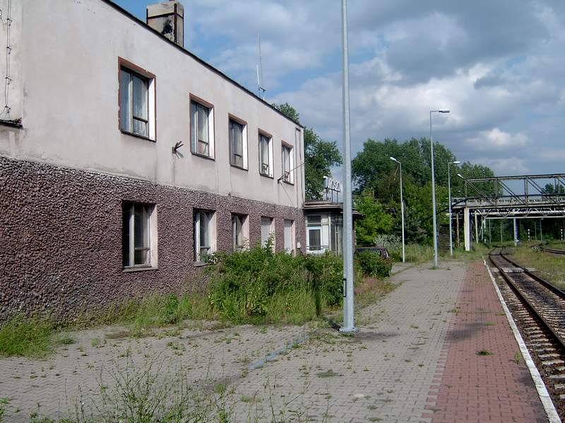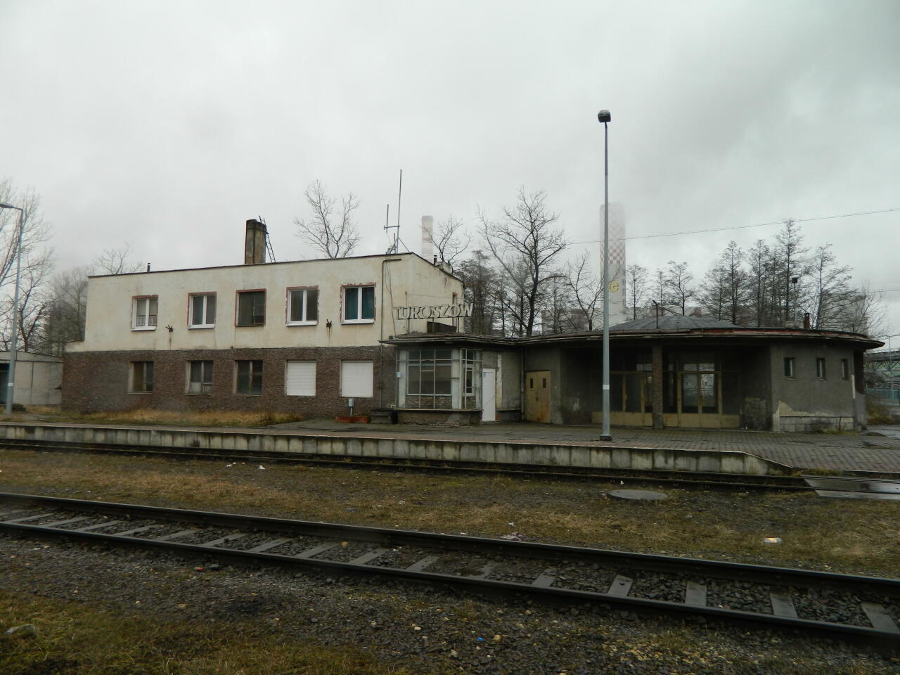Budynek dworcowy, w którym rezyduje dyżurny ruchu. Część pasażerska opuszczona i zdewastowana. W tle potężna chłodnia kominowa elektrowni "Turów", powstająca wraz z nowym blokiem energetycznym. Widok w kierunku zachodnim (Trzciniec Zgorzelecki).
