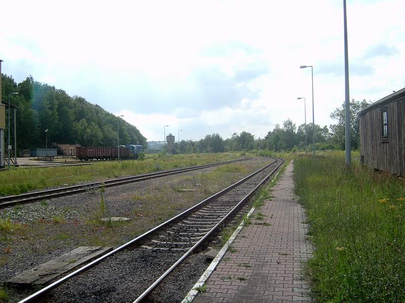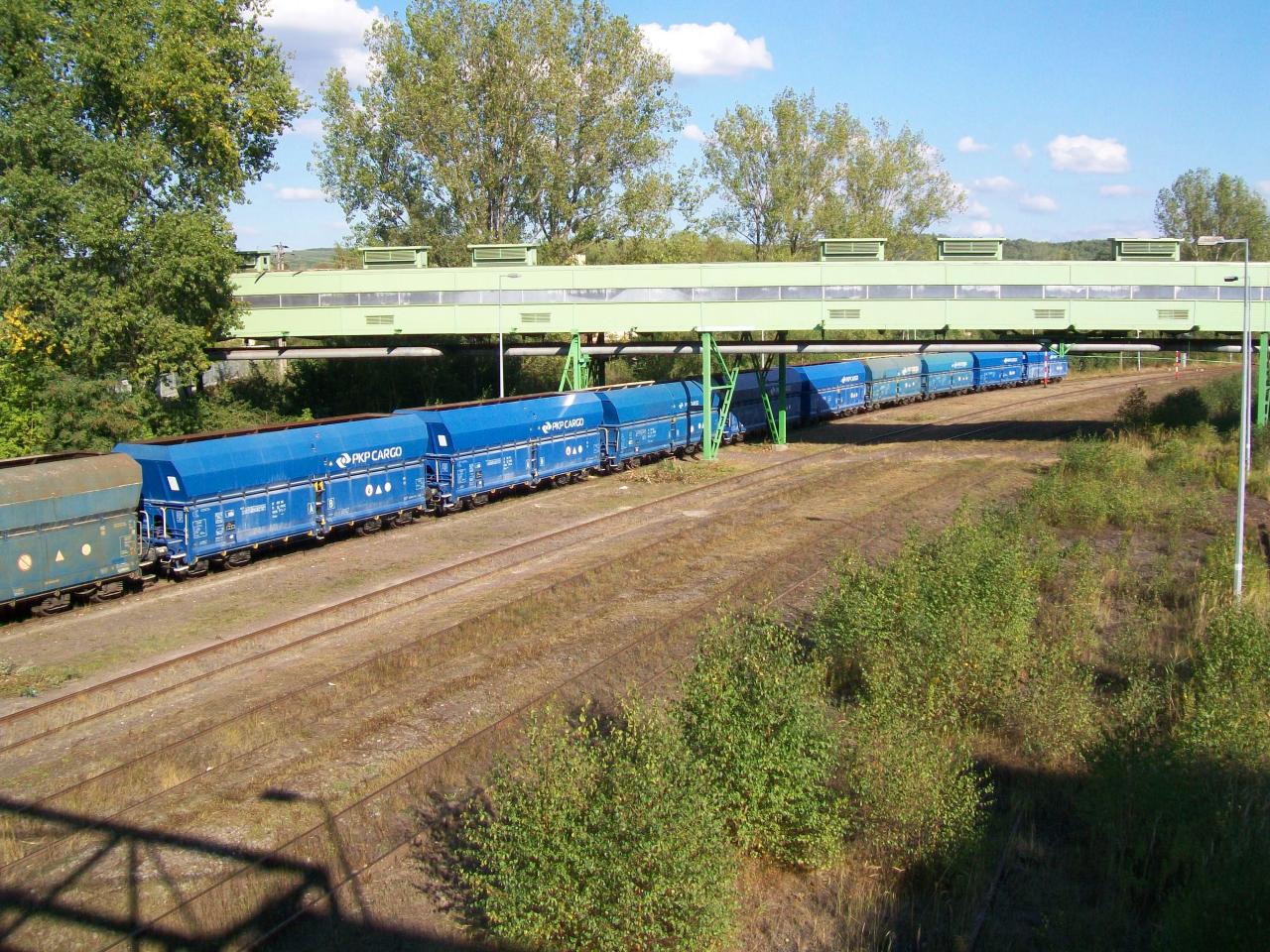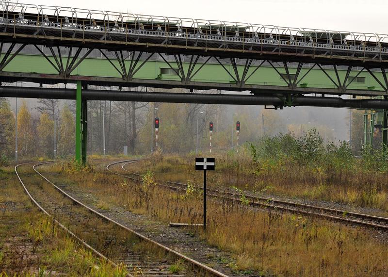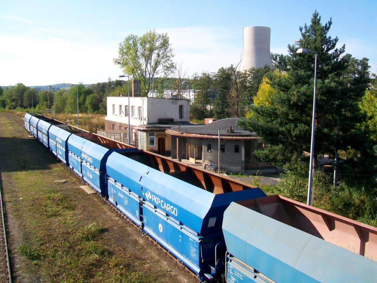Równia stacyjna z taśmociągiem transportującym węgiel do elektrowni "Turów" (w lewo, poza kadrem). Widok w kierunku wschodnim (Bogatynia).