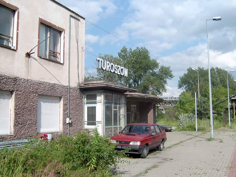 Turoszów, budynki dawnej stacji kolejowej. Obecnie brak ruchu osobowego, tylko towarowy. W budynku, na parterze mieści się nastawnia dysponująca. W tle kominy elektrowni Turów; w lewo kierunek Gorlitz, Sulików i Zawidów, prawo Bogatynia.