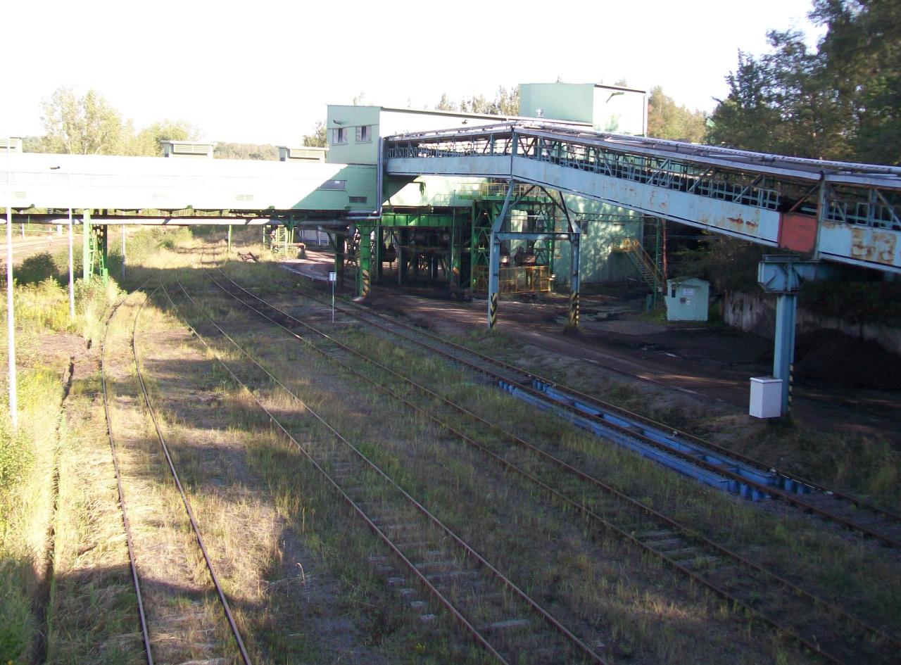W centrum kadru równia stacyjna, z prawej i na wprost taśmociągi transportujące węgiel do elektrowni. Widok w kierunku wschodnim (Bogatynia).