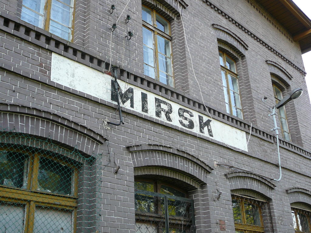 Dworzec w Mirsku - Tablica z nazwą miejscowości.