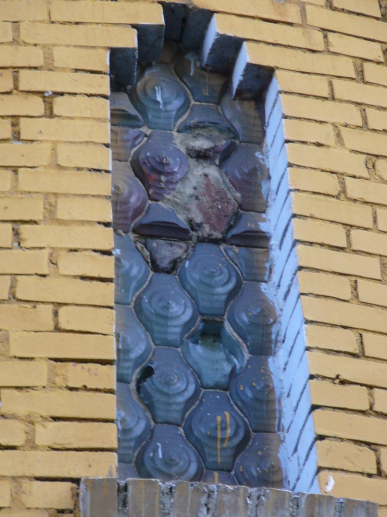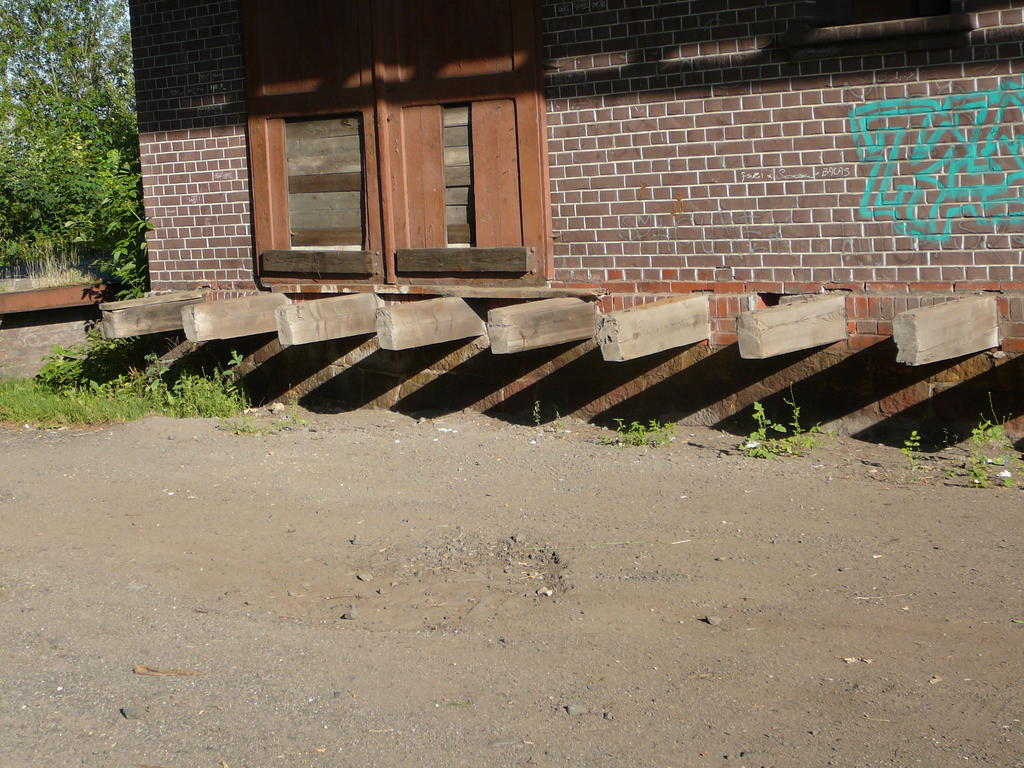 Mirsk. Platforma przy ścianie czołowej magazynu z kółkami (do wiązania koni?).