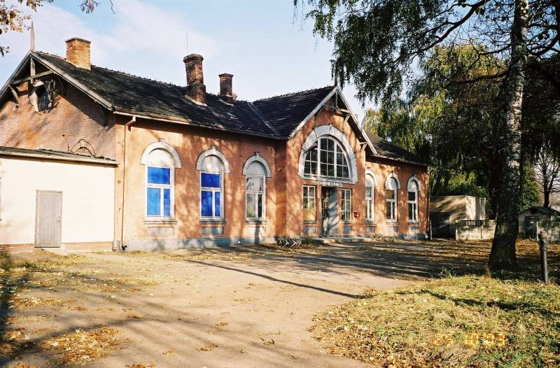Opatówek Wąskotorowy. Budynek dworca od strony stacji Opatówek, daszek nad zamurowanym wejściem ma nowe przeznaczenie.