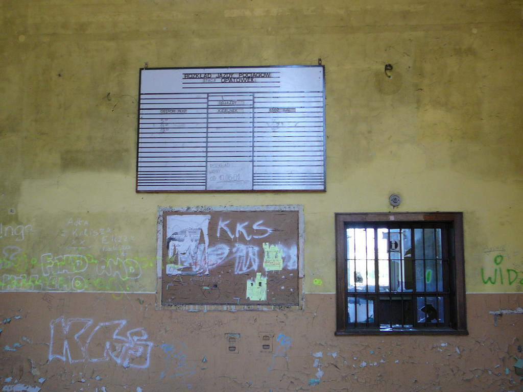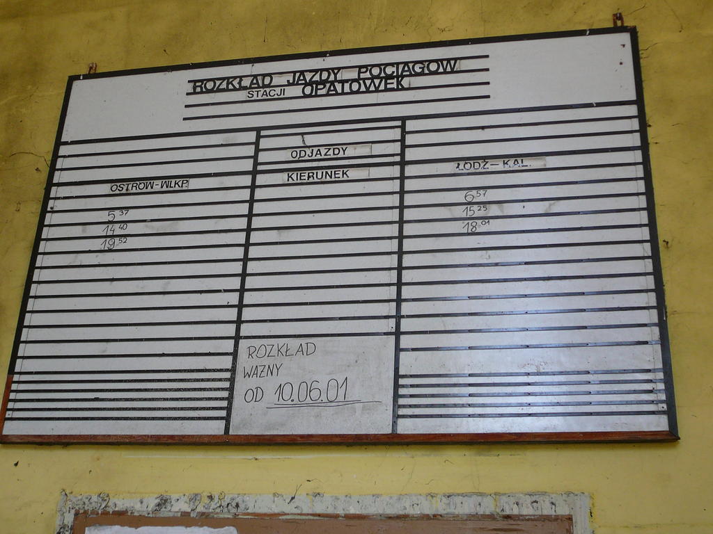 Opatówek. Rozkład jazdy w poczekalni, niezbyt aktualny.