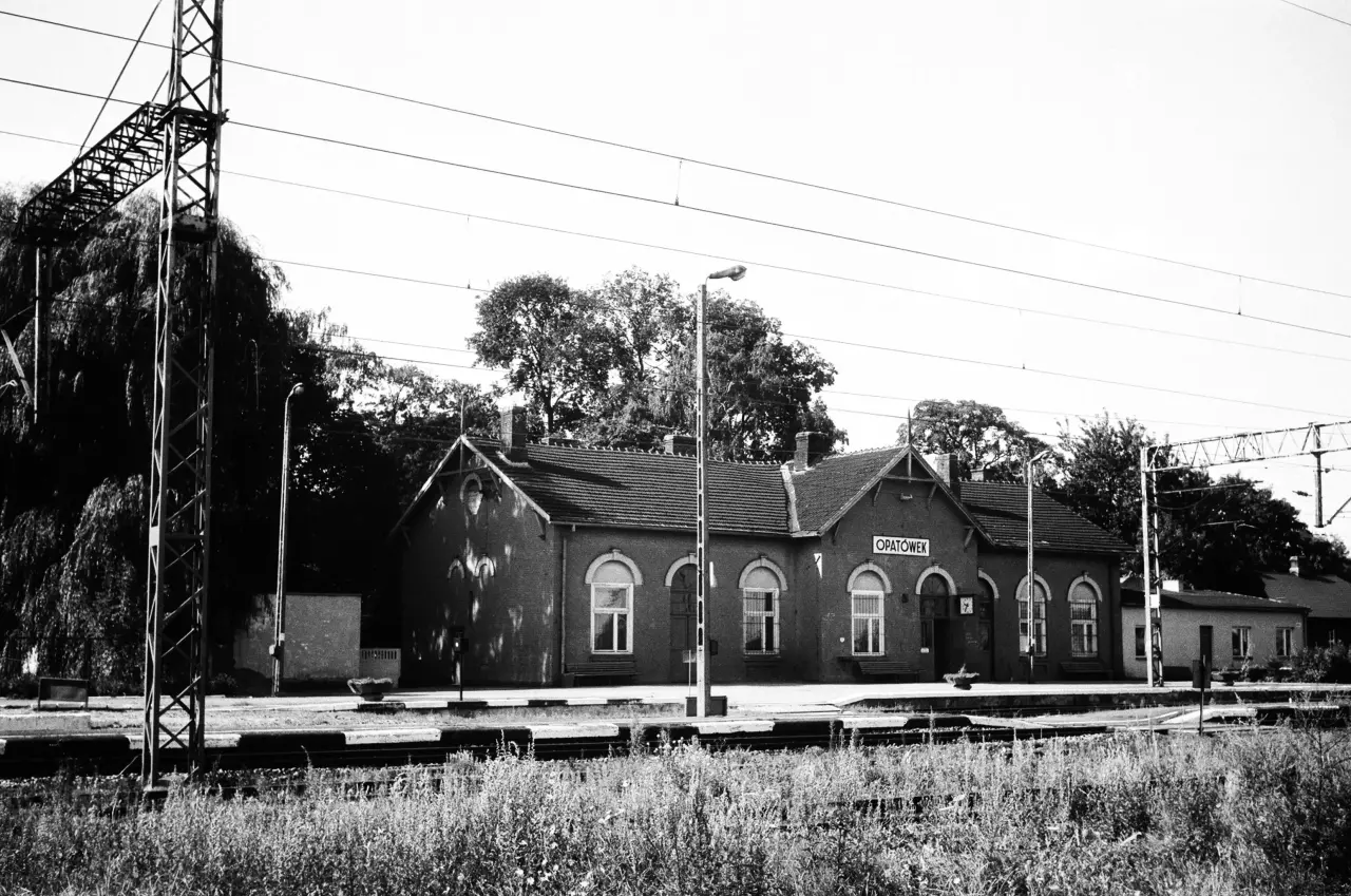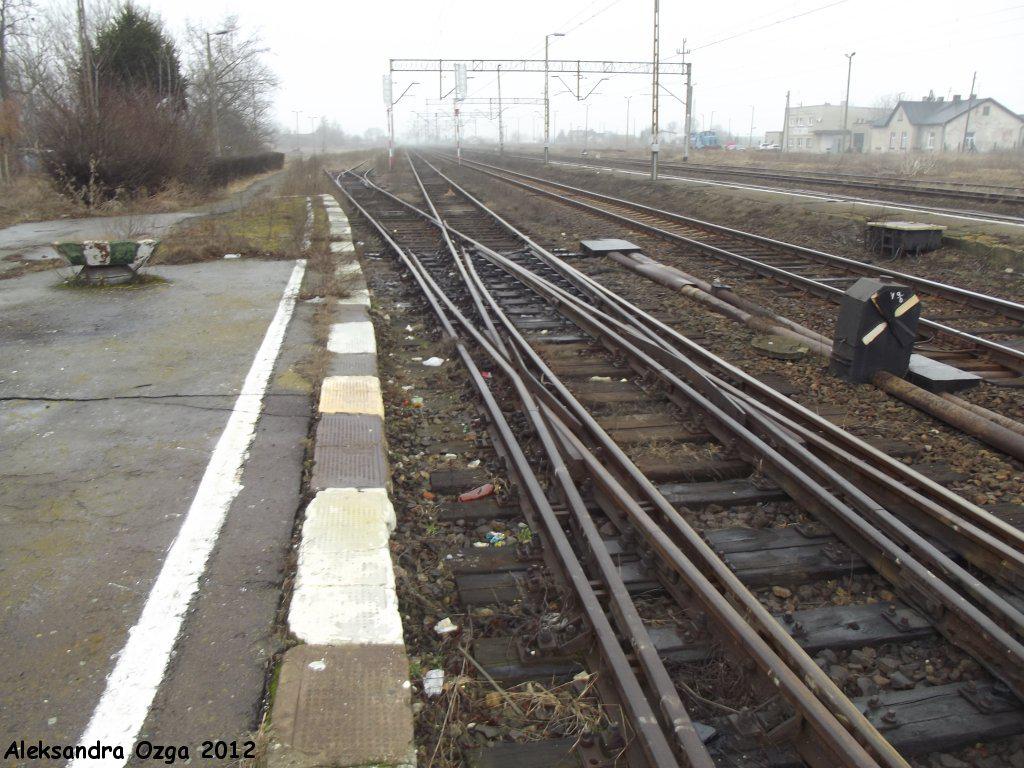 Opatówek. Perony, budynek dworca, tory w kierunku Kalisza, w metalowej bramce przed kozłem oporowym była kiedyś tablica z nazwą stacji.