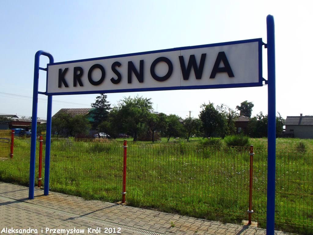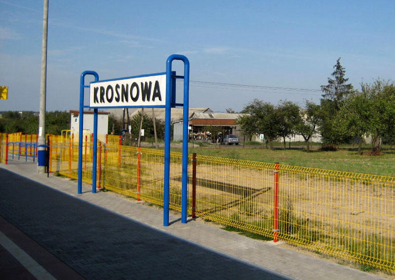 Przystanek PKP Krosnowa. Tablica przystanku na zmodernizowanym peronie.