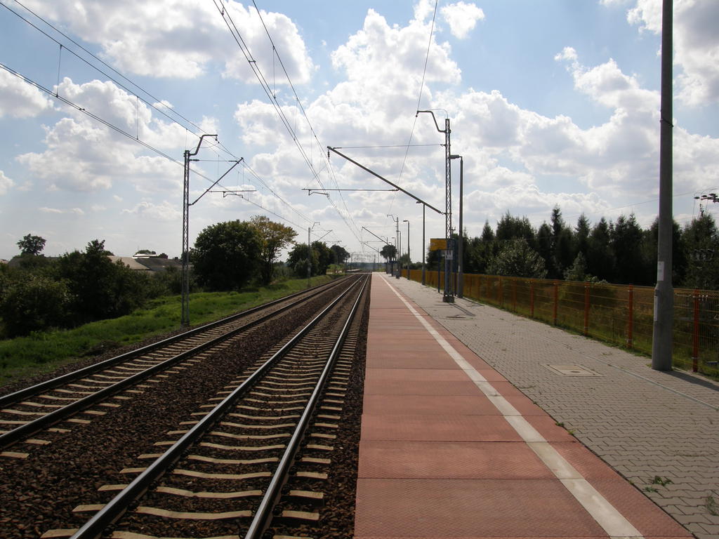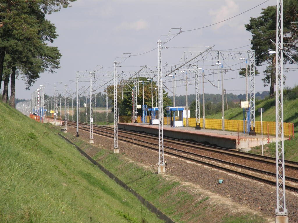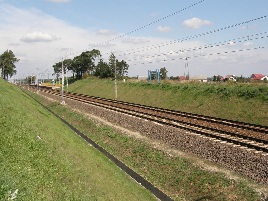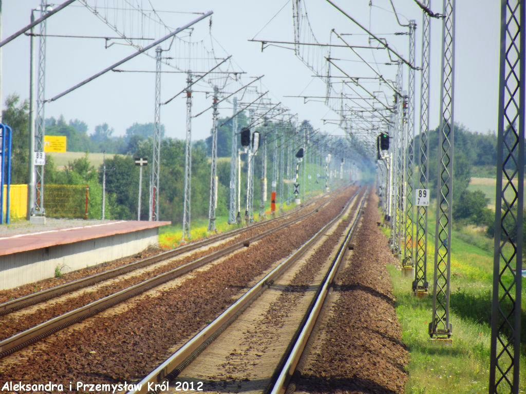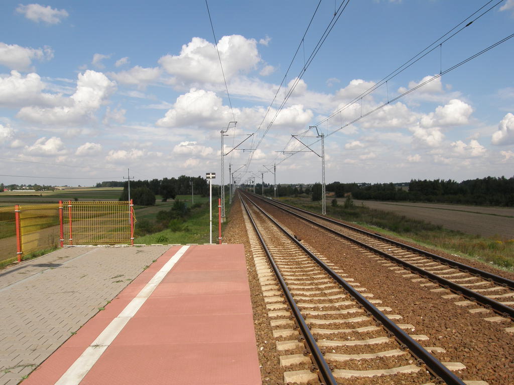 W oddali peron dla pociągów w kierunku Skierniewic. Widok w kierunku Skierniewic. 90,2 km.