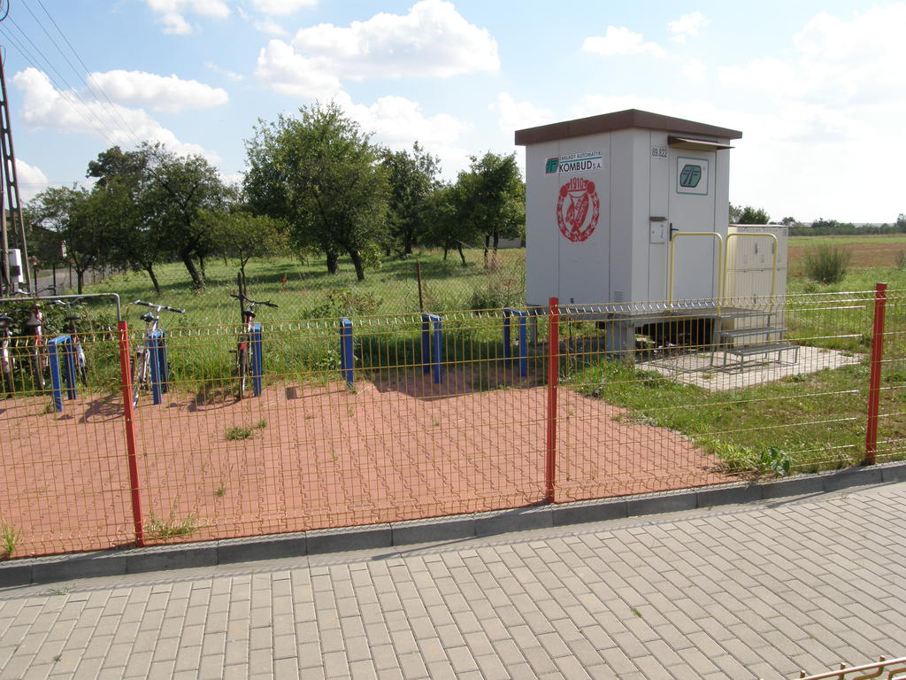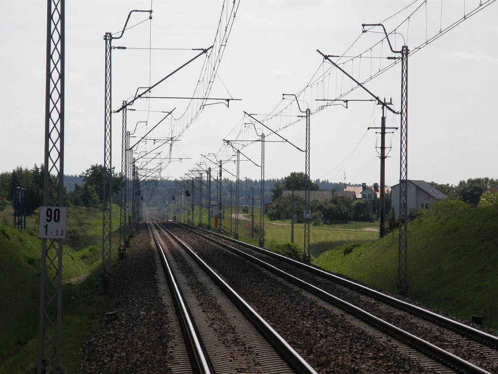 W oddali tarcze OSP. W oddali system wykrywania stanów awaryjnych taboru kolejowego wykrywa zagrzane osie oraz zablokowane hamulce. Widok w kierunku Koluszek. 90,1 km.