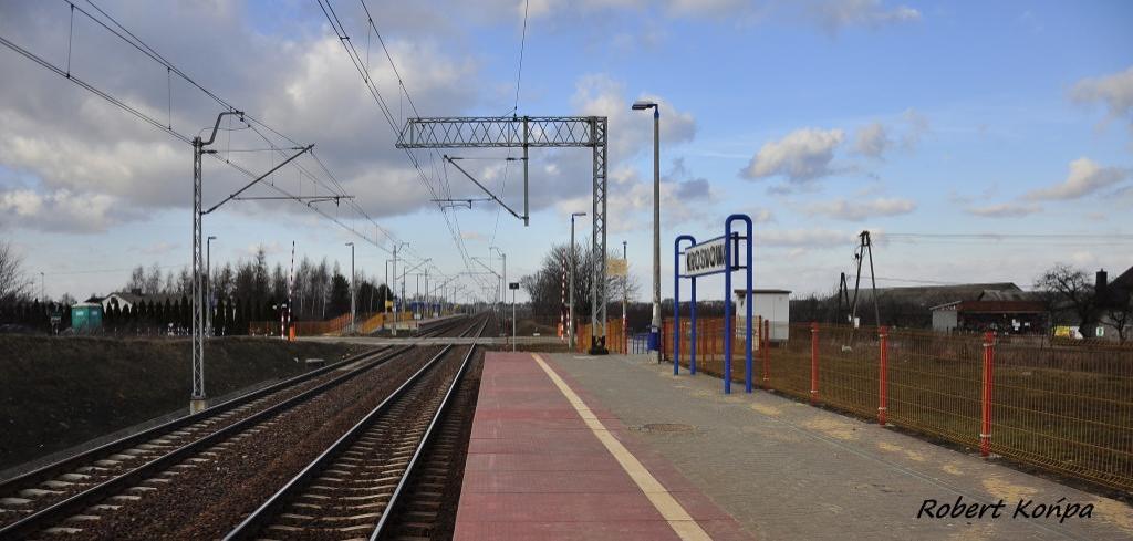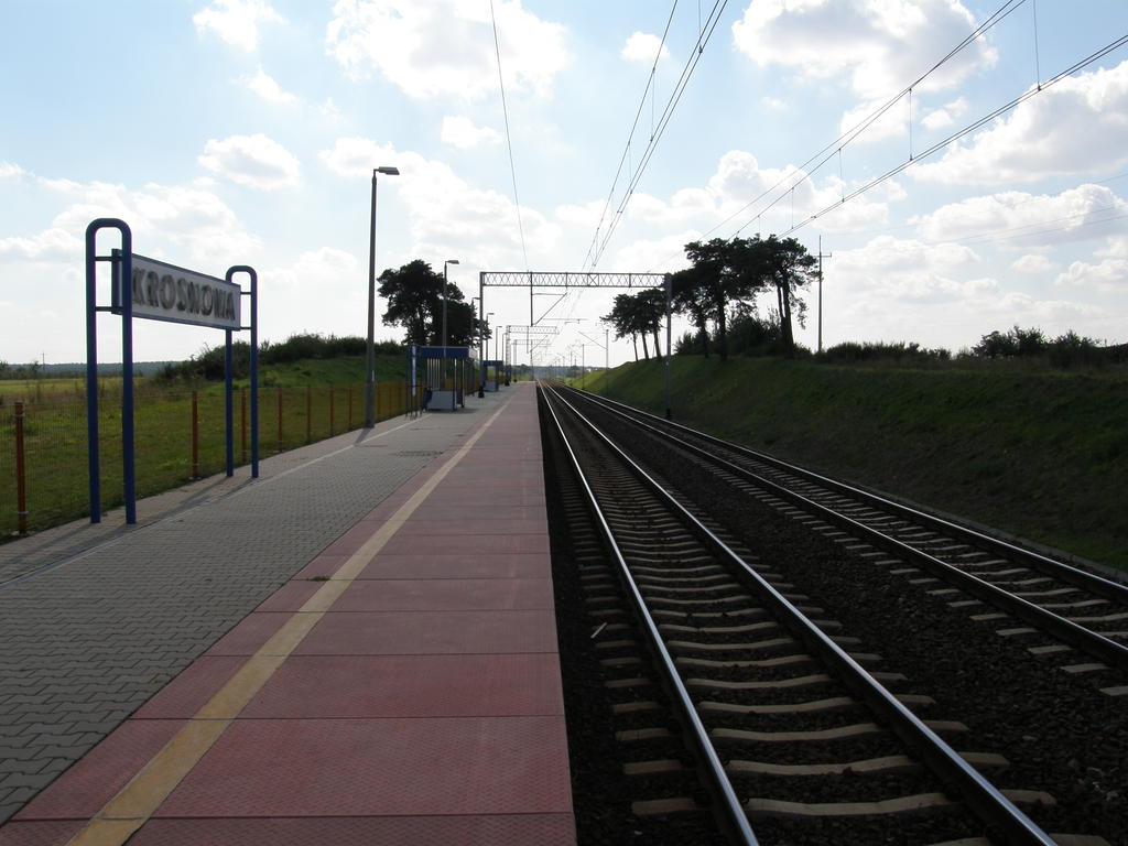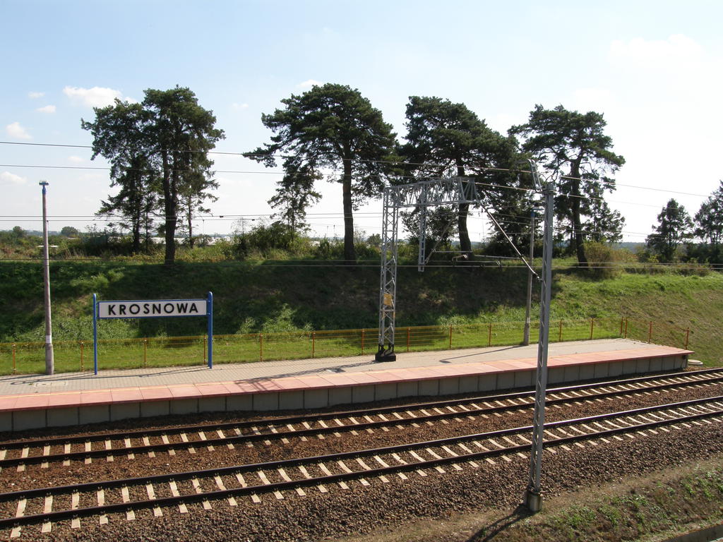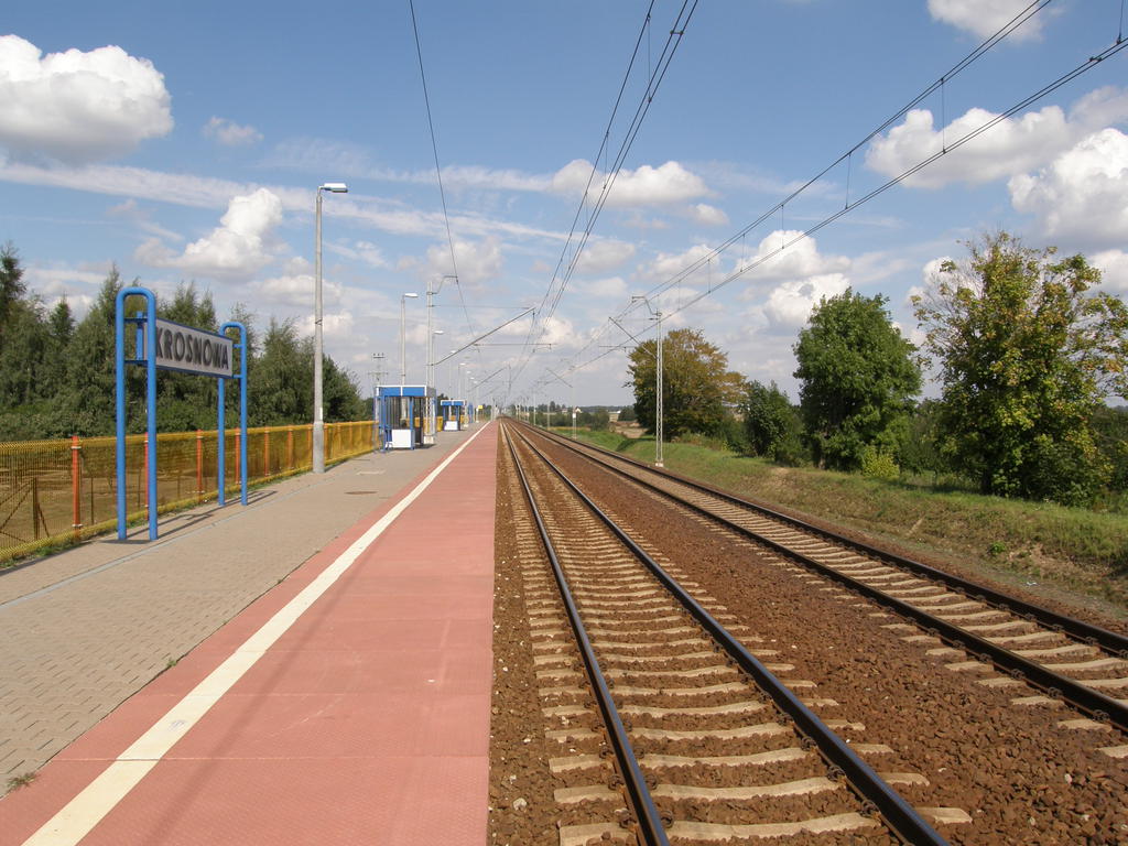 Przystanek Krosnowa. Peron dla pociągów w kierunku Skierniewic (bliżej). Widok w kierunku Skierniewic. 90,0 km.