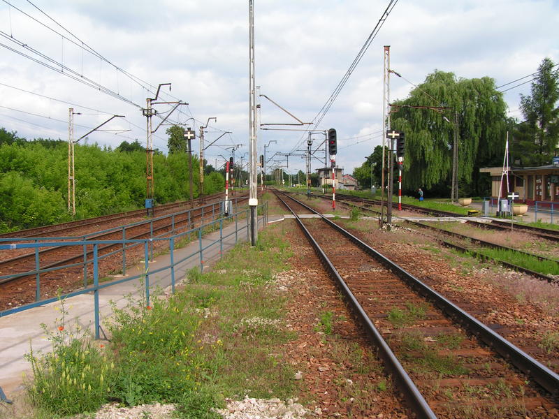 Wszystkie cztery semafory wyjazdowe od strony Tarnowa. Po prawej budynek dworca od strony torów. Po prawej w oddali nastawnia dysponująca. Widok w stronę Tarnowa.